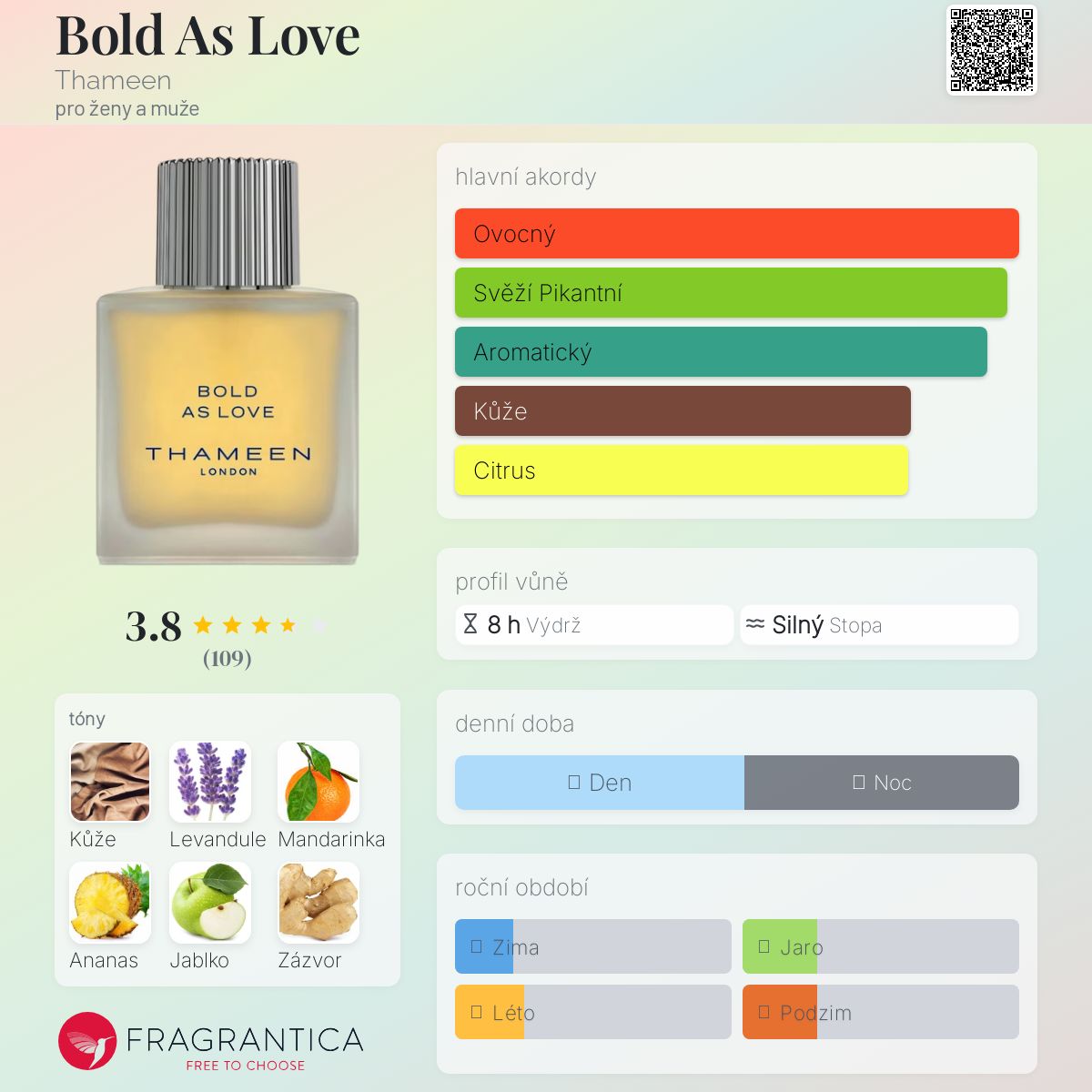 Bold As Love podle Thameen je vůně pro ženy a muže. Toto je nová vůně. Bold As Love byl/a uveden/a v roce 2024. "Nosem" za touto vůní je Pierre Negrin. Vrchní tóny jsou Mandarinka, Ananas, Jablko a Zázvor; střední tóny jsouLevandule, Jalovcové bobulky a Pelargónie ; základní tóny jsou Kůže, Vetiver a Pačuli.