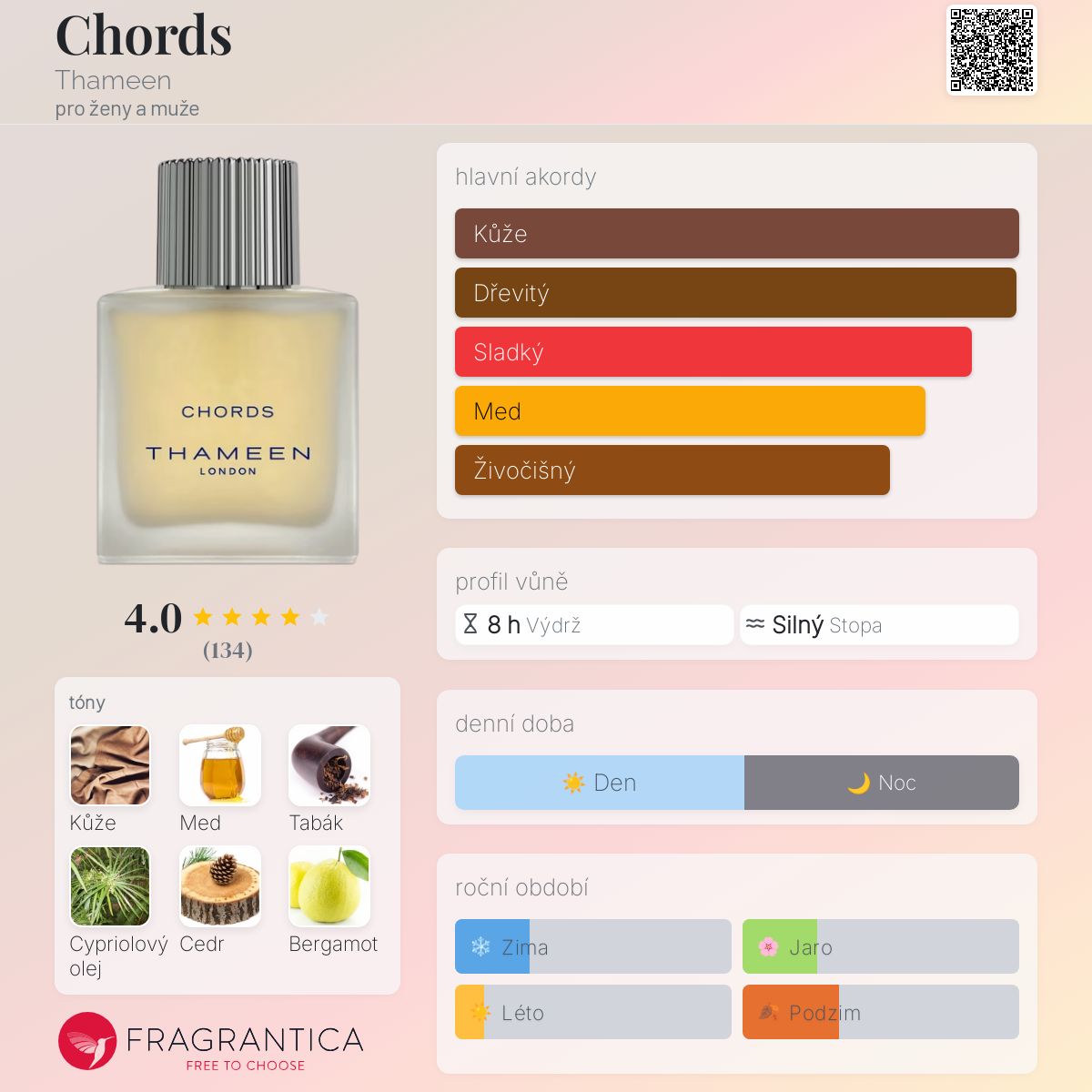 Chords podle Thameen je Orientální Floral vůně pro ženy a muže. Toto je nová vůně. Chords byl/a uveden/a v roce 2024. "Nosem" za touto vůní je Nathalie Lorson. Vrchní tóny jsou Bergamot, Pomerančový květ a Neroli; střední tóny jsouMed, Tabák a Ylang-Ylang ; základní tóny jsou Kůže, Cypriolový olej a Cedr.