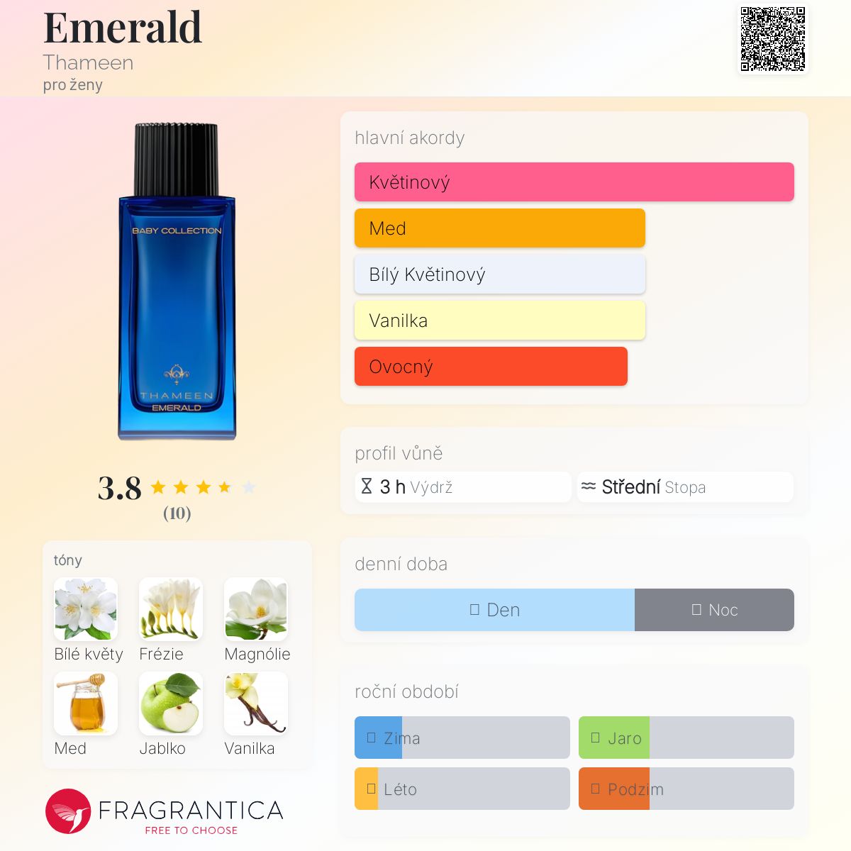 Emerald podle Thameen je Floral vůně pro ženy. Emerald byl/a uveden/a v roce 2016. Vrchní tóny jsou Bílé květy, Frézie a Magnólie; střední tóny jsouMed a Jablko ; základní tón je Vanilka.