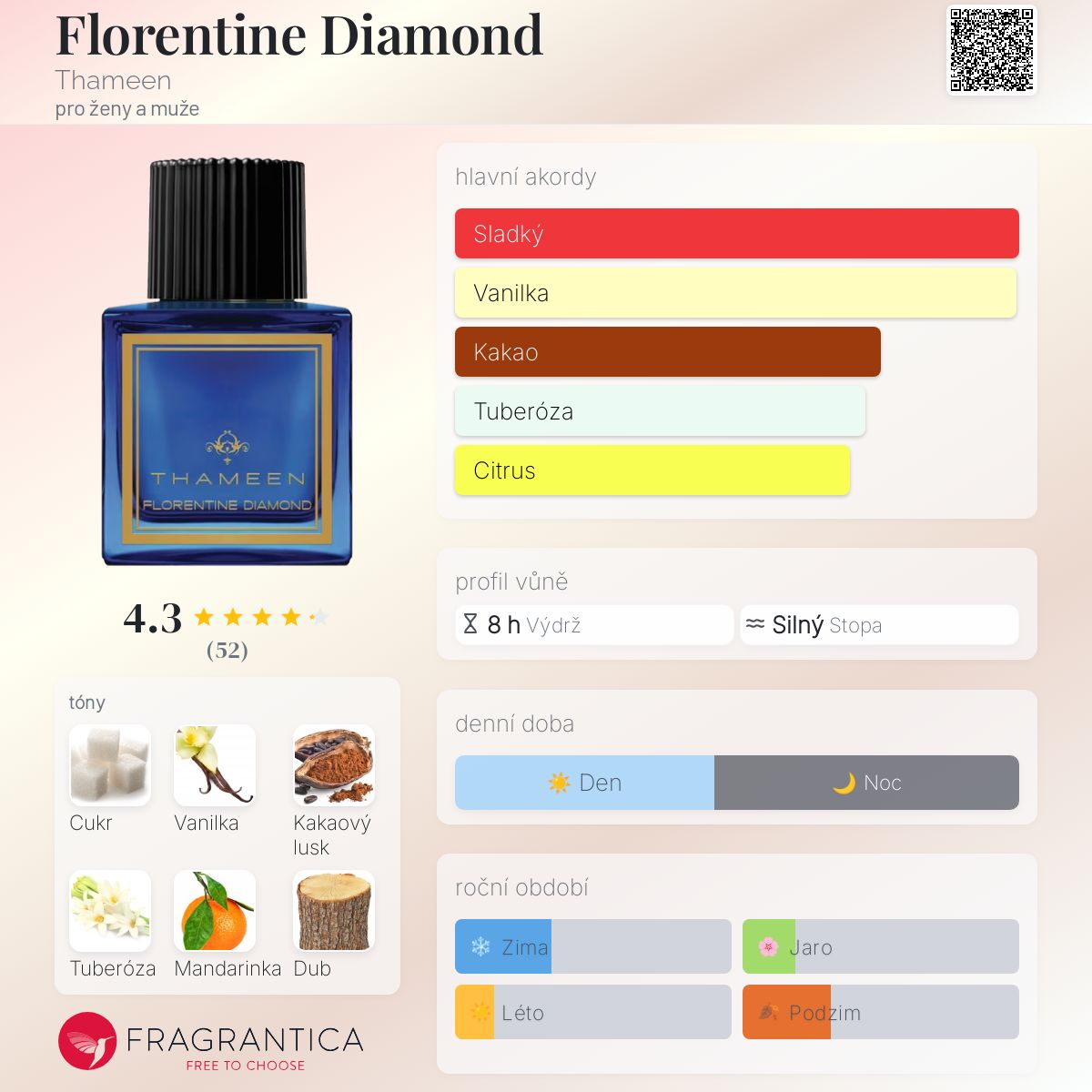Florentine Diamond podle Thameen je Orientální Vanilla vůně pro ženy a muže. Toto je nová vůně. Florentine Diamond byl/a uveden/a v roce 2025. Vrchní tóny jsou Kakao a Mandarinka; střední tóny jsouCukrová třtina, Tuberóza a Ječmen ; základní tóny jsou Vanilka, Dub a Agarové dřevo (oud).