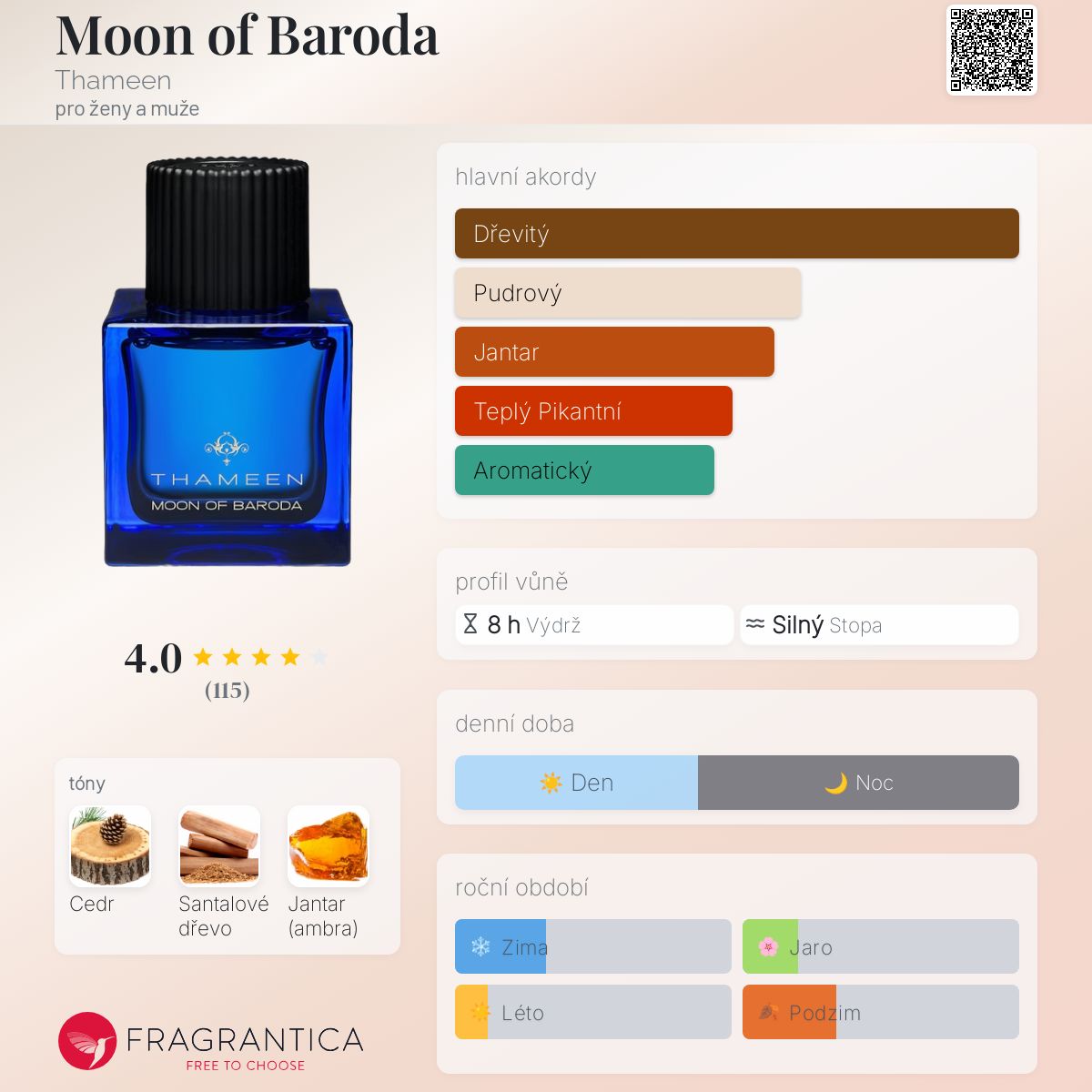 Moon of Baroda podle Thameen je Orientální Woody vůně pro ženy a muže. Moon of Baroda byl/a uveden/a v roce 2013. Vrchní tón je Cedr ; střední tón jeJantar (ambra) ; základní tón je Santalové dřevo.