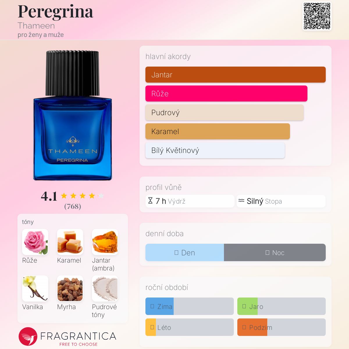 Peregrina podle Thameen je Orientální Floral vůně pro ženy a muže. Peregrina byl/a uveden/a v roce 2019. Vrchní tóny jsou Damašská růže, Gardénie, Jasmín a Konvalinka; střední tóny jsouKaramel, Jantar (ambra), Vanilka, Myrha a Ylang-Ylang ; základní tóny jsou Jantar (ambra), Pudrové tóny a Bílé pižmo.