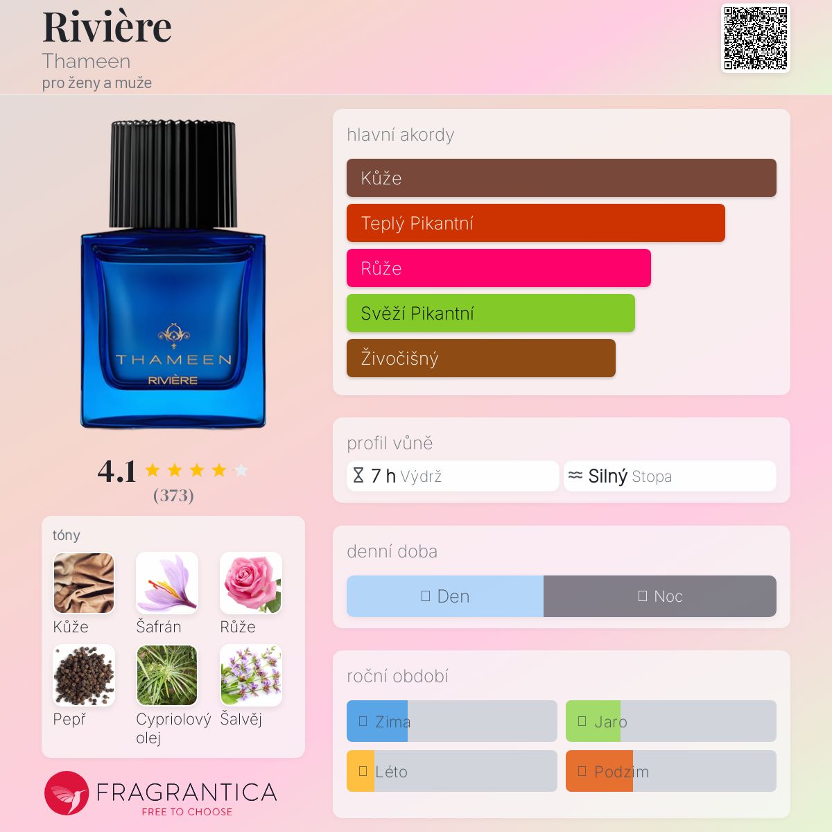 Rivière podle Thameen je Orientální Spicy vůně pro ženy a muže. Rivière byl/a uveden/a v roce 2016. "Nosem" za touto vůní je Julia Rodriguez Pastor. Vrchní tóny jsou Šafrán a Černý pepř; střední tóny jsouTurecká růže, Šalvěj a Karafiát ; základní tóny jsou Kůže a Cypriolový olej.
