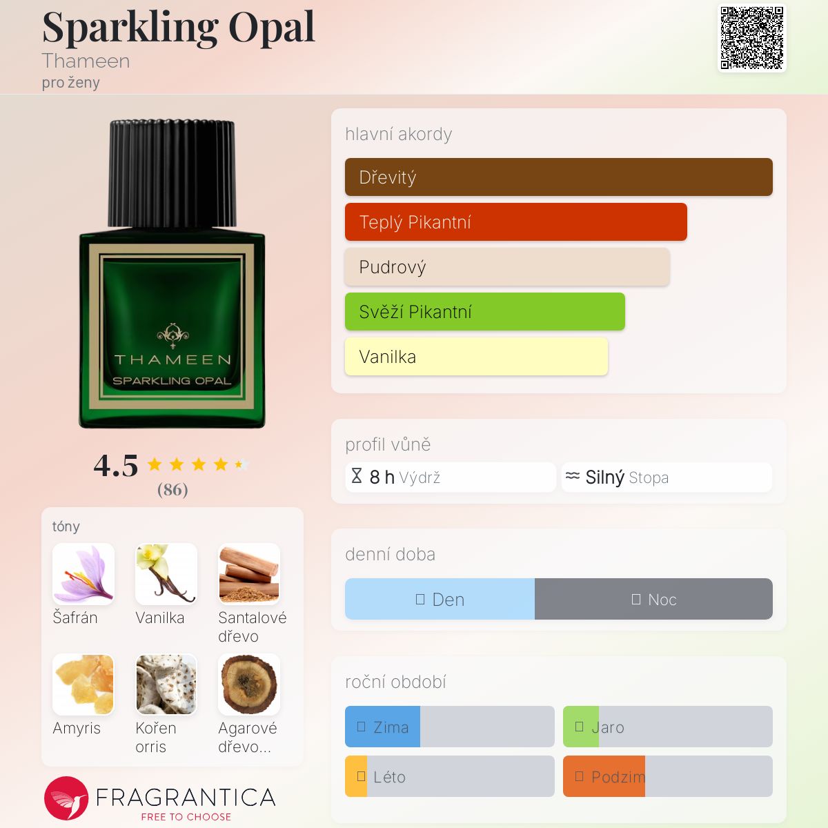 Sparkling Opal podle Thameen je vůně pro ženy. Sparkling Opal byl/a uveden/a v roce 2020. Vrchní tóny jsou Šafrán, Muškátový oříšek a Pepř; střední tóny jsouKořen orris, Agarové dřevo (oud), Skořice, Labdanum, Růže, Jasmín a Cedr ; základní tóny jsou Vanilka, Santalové dřevo, Amyris, Guajakové dřevo, Kůže, Pižmo a Cedr.