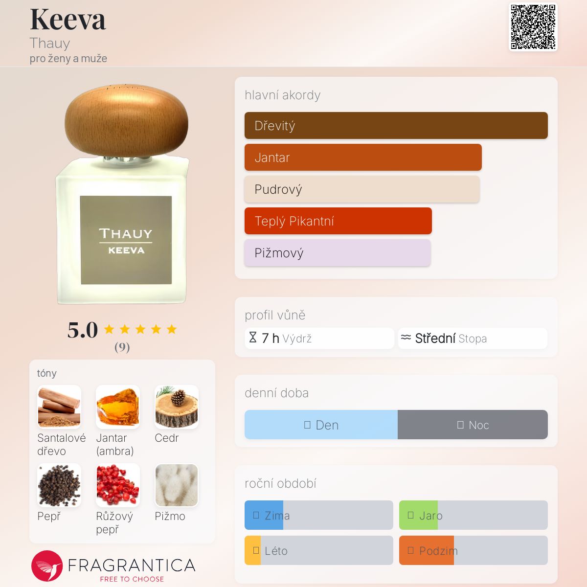 Keeva podle Thauy je Woody Spicy vůně pro ženy a muže. Toto je nová vůně. Keeva byl/a uveden/a v roce 2024. "Nosem" za touto vůní je Daniel Josier. Vrchní tóny jsou Černý pepř, Hruška a Pivoňka; střední tóny jsouSantalové dřevo, Růžový pepř a Černý rybíz ; základní tóny jsou Jantar (ambra), Cedr a Pižmo.