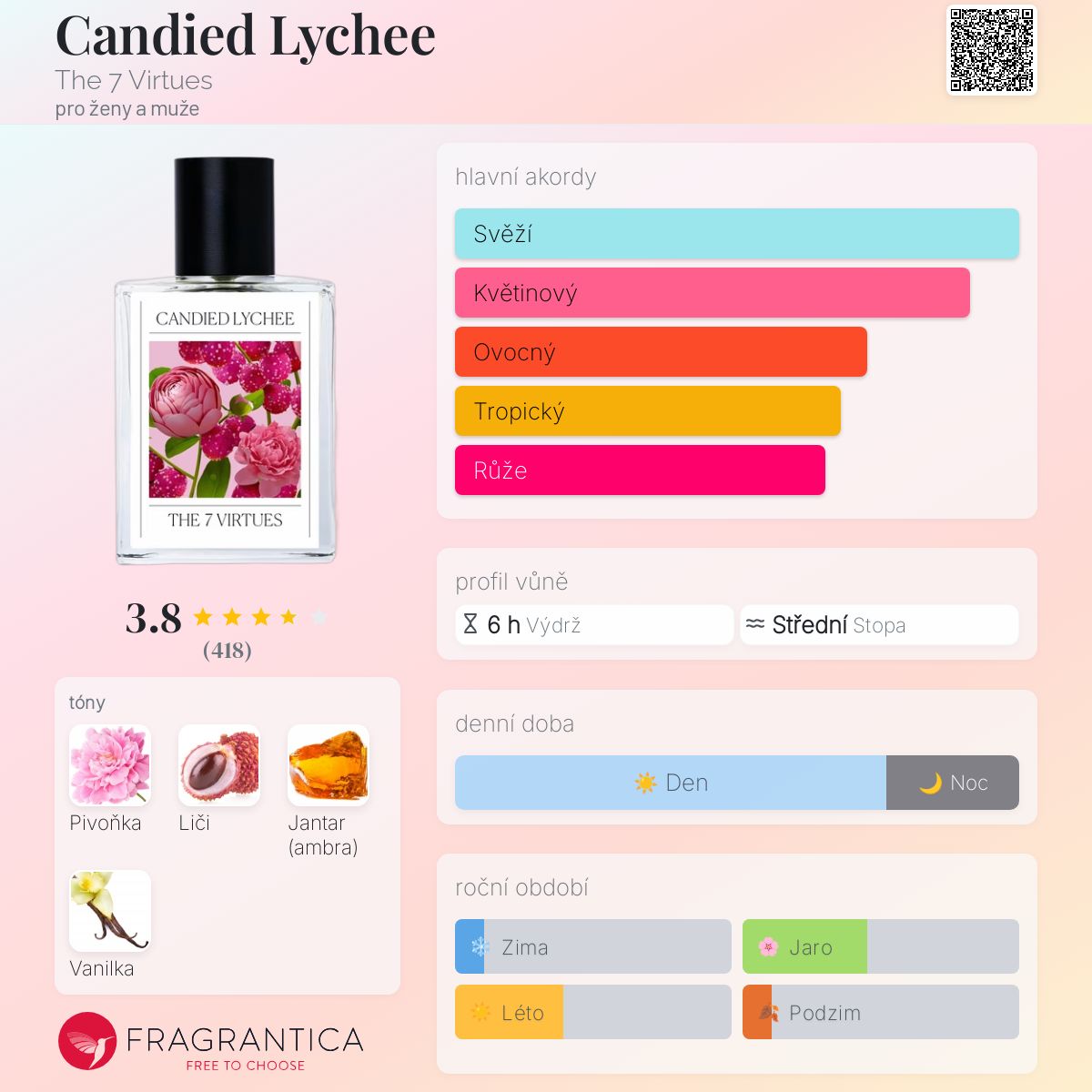 Candied Lychee podle The 7 Virtues je Floral Fruity vůně pro ženy a muže. Toto je nová vůně. Candied Lychee byl/a uveden/a v roce 2024. "Nosem" za touto vůní je Julie Pluchet. Vrchní tón je Liči ; střední tón jePivoňka ; základní tóny jsou Křišťálový jantar a Vanilka.