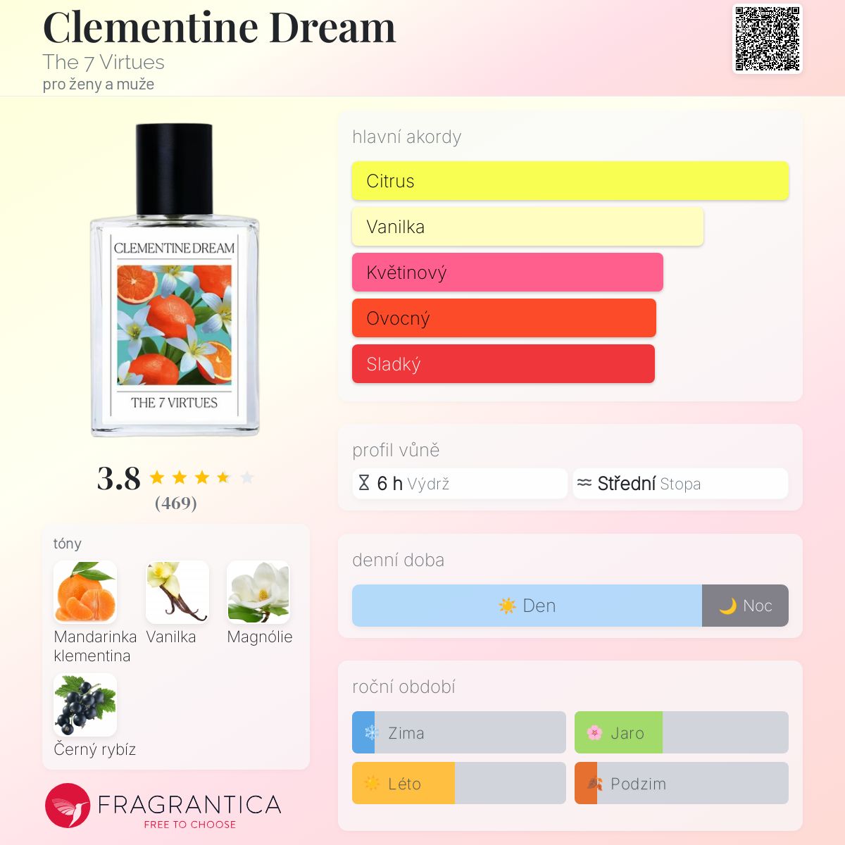 Clementine Dream podle The 7 Virtues je Floral Fruity vůně pro ženy a muže. Toto je nová vůně. Clementine Dream byl/a uveden/a v roce 2025. "Nosem" za touto vůní je Kamila Lelakova. Vrchní tóny jsou Mandarinka klementina a Černý rybíz; střední tón jeMagnólie ; základní tón je Vanilka.