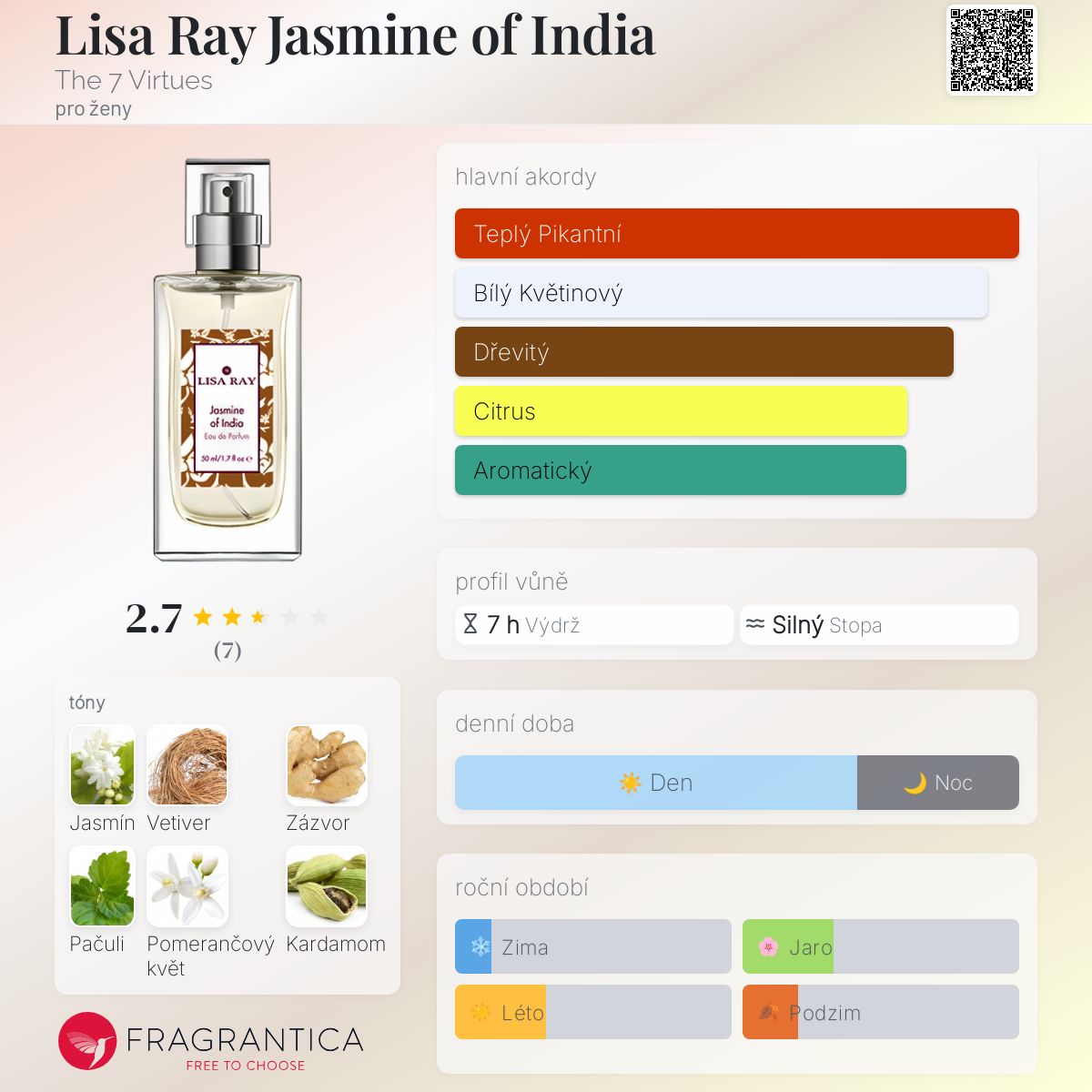 Lisa Ray Jasmine of India podle The 7 Virtues je Floral vůně pro ženy. Lisa Ray Jasmine of India byl/a uveden/a v roce 2016. Vrchní tóny jsou Bergamot a Pomeranč; střední tóny jsouJasmín, Zázvor, Pomerančový květ a Kardamom ; základní tóny jsou Vetiver, Pačuli, Myrha, Olibanum a Cedr.