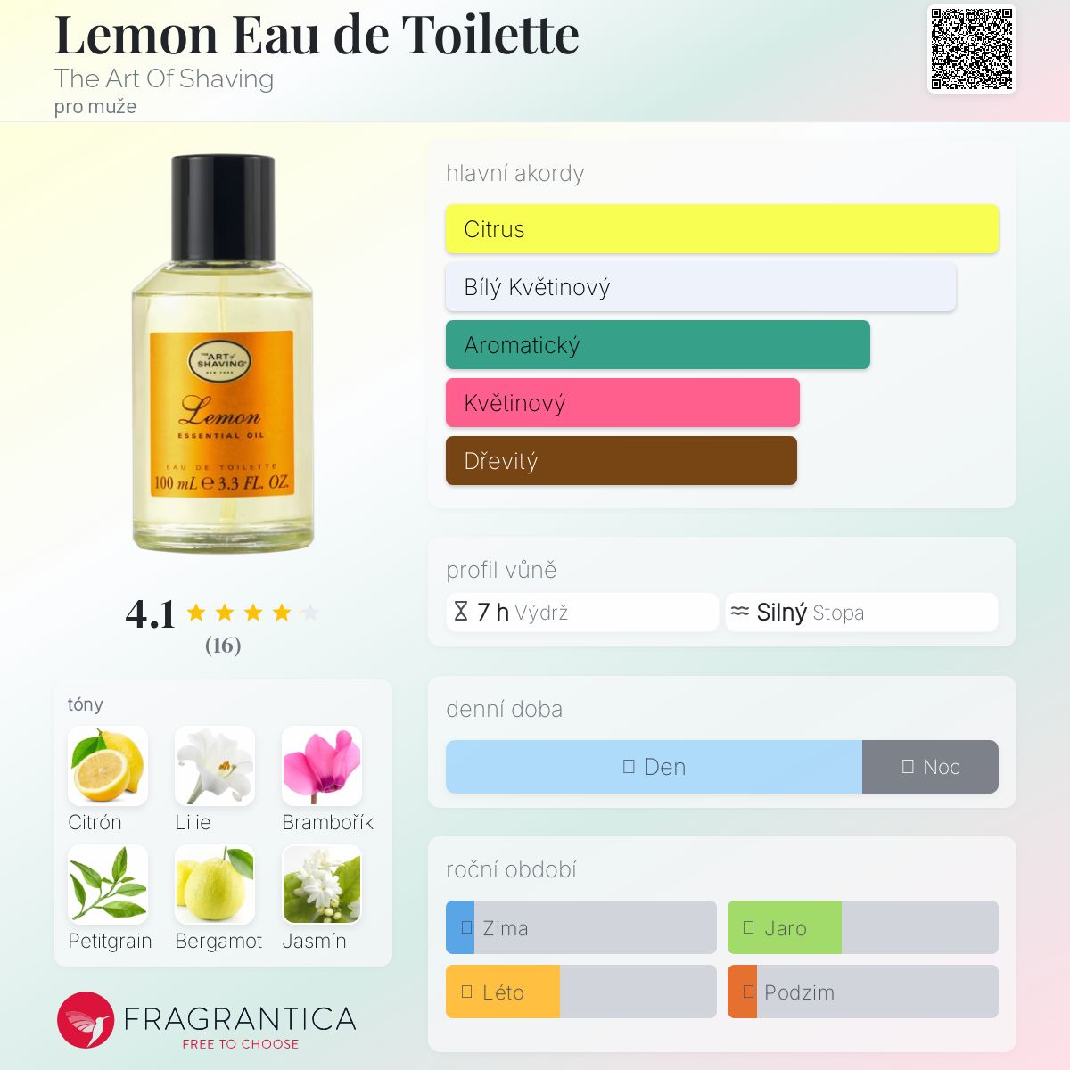 Lemon Eau de Toilette podle The Art Of Shaving je Citrus vůně pro muže. Lemon Eau de Toilette byl/a uveden/a v roce 2006. Vrchní tóny jsou Citrón, Petitgrain, Bergamot a Mandarinkový list; střední tóny jsouBílá lilie, Brambořík a Jasmín ; základní tóny jsou Vetiver a Dubový mech.