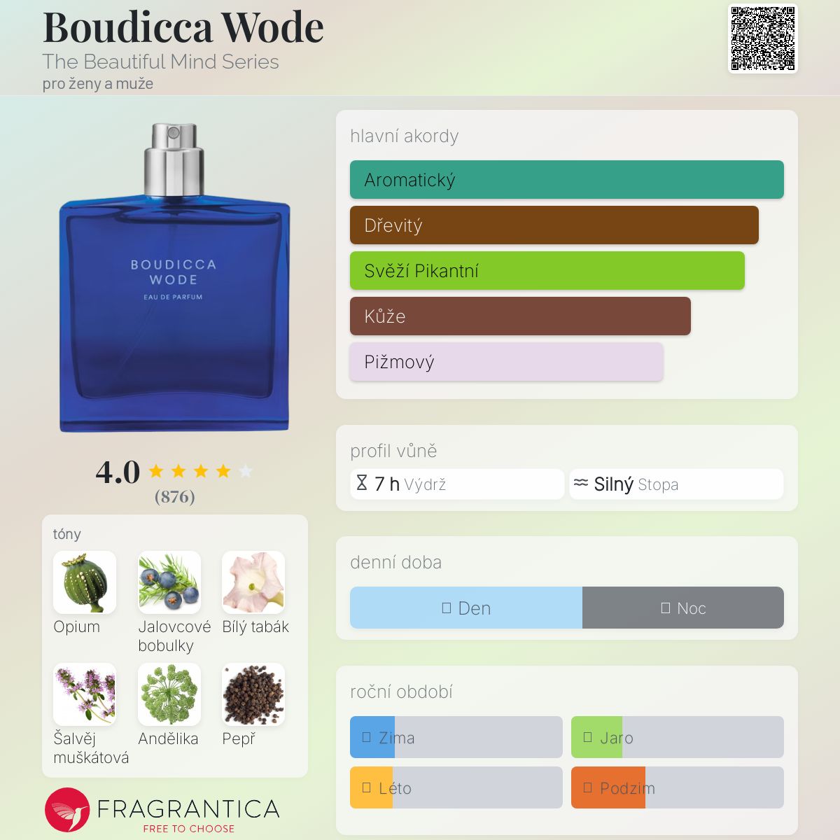 Boudicca Wode podle The Beautiful Mind Series je Woody vůně pro ženy a muže. Boudicca Wode byl/a uveden/a v roce 2014. "Nosem" za touto vůní je Geza Schoen. Vrchní tóny jsou Jalovcové bobulky, Šalvěj muškátová, Andělika, Černý a růžový pepř, Koriandr, Vodní tóny a Bergamot; střední tóny jsouKmín, Šafrán, Jasmín, Tuberóza a Růže ; základní tóny jsou Opium, Bílý tabák, Kůže, Kastoreum, Dubový mech, Guajakové dřevo, Styrax, Cedr, Pižmo, Santalové dřevo, Fazole tonka a Jantar (ambra).