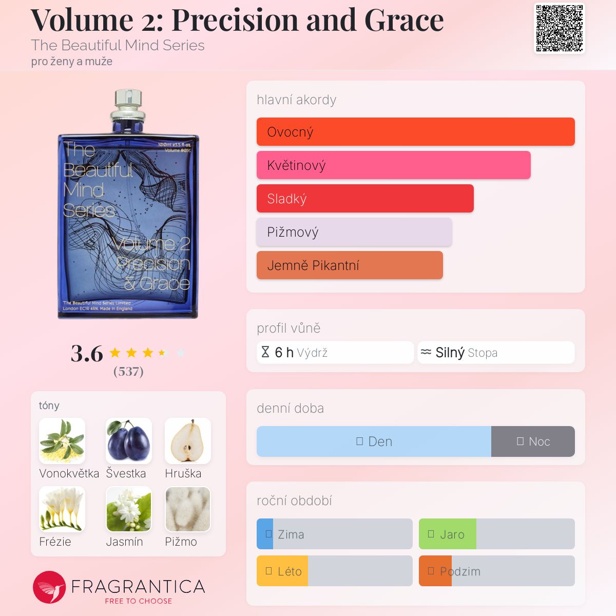 Volume 2: Precision and Grace podle The Beautiful Mind Series je Floral Fruity vůně pro ženy a muže. Volume 2: Precision and Grace byl/a uveden/a v roce 2015. Vrchní tóny jsou Hruška, Citrón, Mandarinka a Bergamot; střední tóny jsouVonokvětka, Švestka, Frézie, Egyptský jasmín, Růžový pepř, Mimóza, Fialka a Růže ; základní tóny jsou Pižmo, Santalové dřevo, Mech, Jantar (ambra), Kastoreum a Myrha.