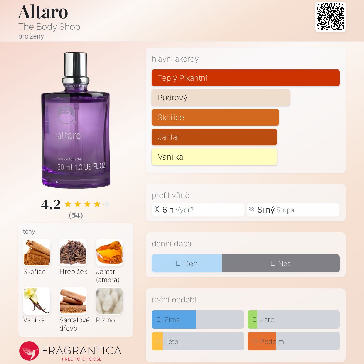 Altaro podle The Body Shop je Orientální Spicy vůně pro ženy. Altaro byl/a uveden/a v roce 2004. Vrchní tóny jsou Skořice a Aldehydy; střední tóny jsouHřebíček a Santalové dřevo ; základní tóny jsou Jantar (ambra), Vanilka a Pižmo.