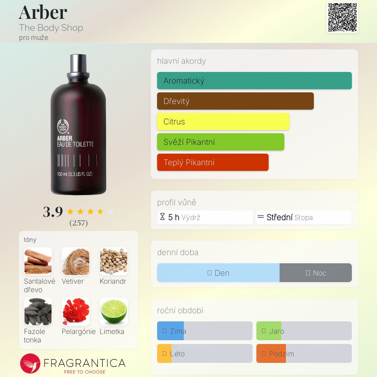 Arber podle The Body Shop je Woody Aromatic vůně pro muže. Arber byl/a uveden/a v roce 2002. Vrchní tóny jsou Pelargónie, Limetka a Pomeranč; střední tóny jsouKoriandr, Vodní meloun a Máta ; základní tóny jsou Santalové dřevo, Vetiver a Fazole tonka.