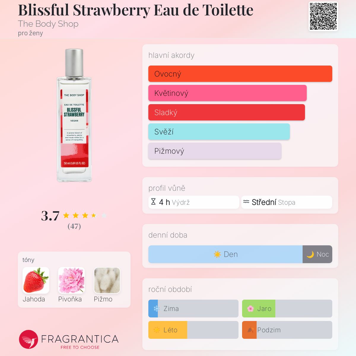 Blissful Strawberry Eau de Toilette podle The Body Shop je Aromatic Fruity vůně pro ženy. Blissful Strawberry Eau de Toilette byl/a uveden/a v roce 2022. Vrchní tón je Jahoda ; střední tón jePivoňka ; základní tón je Pižmo.