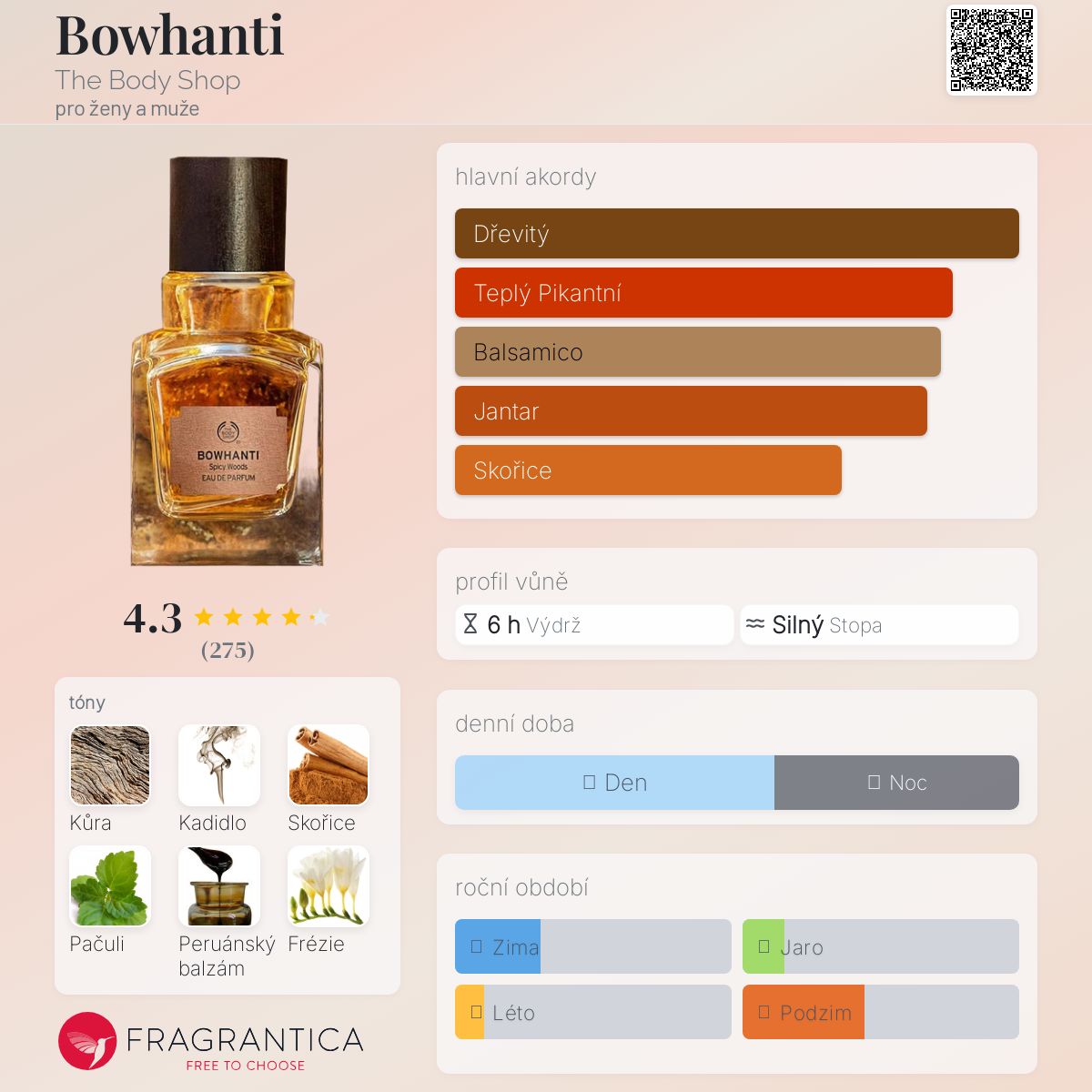 Bowhanti podle The Body Shop je Woody Spicy vůně pro ženy a muže. Bowhanti byl/a uveden/a v roce 2016. Vrchní tóny jsou Jalovcové bobulky, Galbanum a Semena mrkve; střední tóny jsouKůra, Skořice a Frézie ; základní tóny jsou Kadidlo, Pačuli a Peruánský balzám.