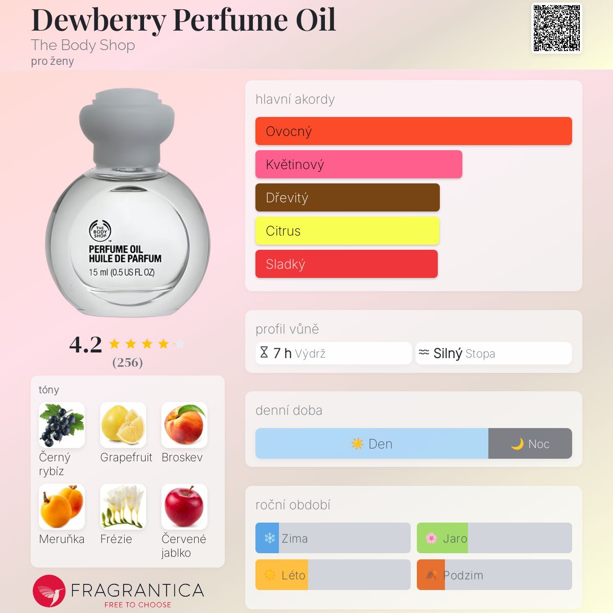 Dewberry Perfume Oil podle The Body Shop je Floral Fruity vůně pro ženy. Vrchní tóny jsou Černý rybíz, Grapefruit, Červené jablko a Hruška; střední tóny jsouFrézie, Jasmín, Růže a Konvalinka ; základní tóny jsou Broskev, Meruňka, Cedr a Pižmo.