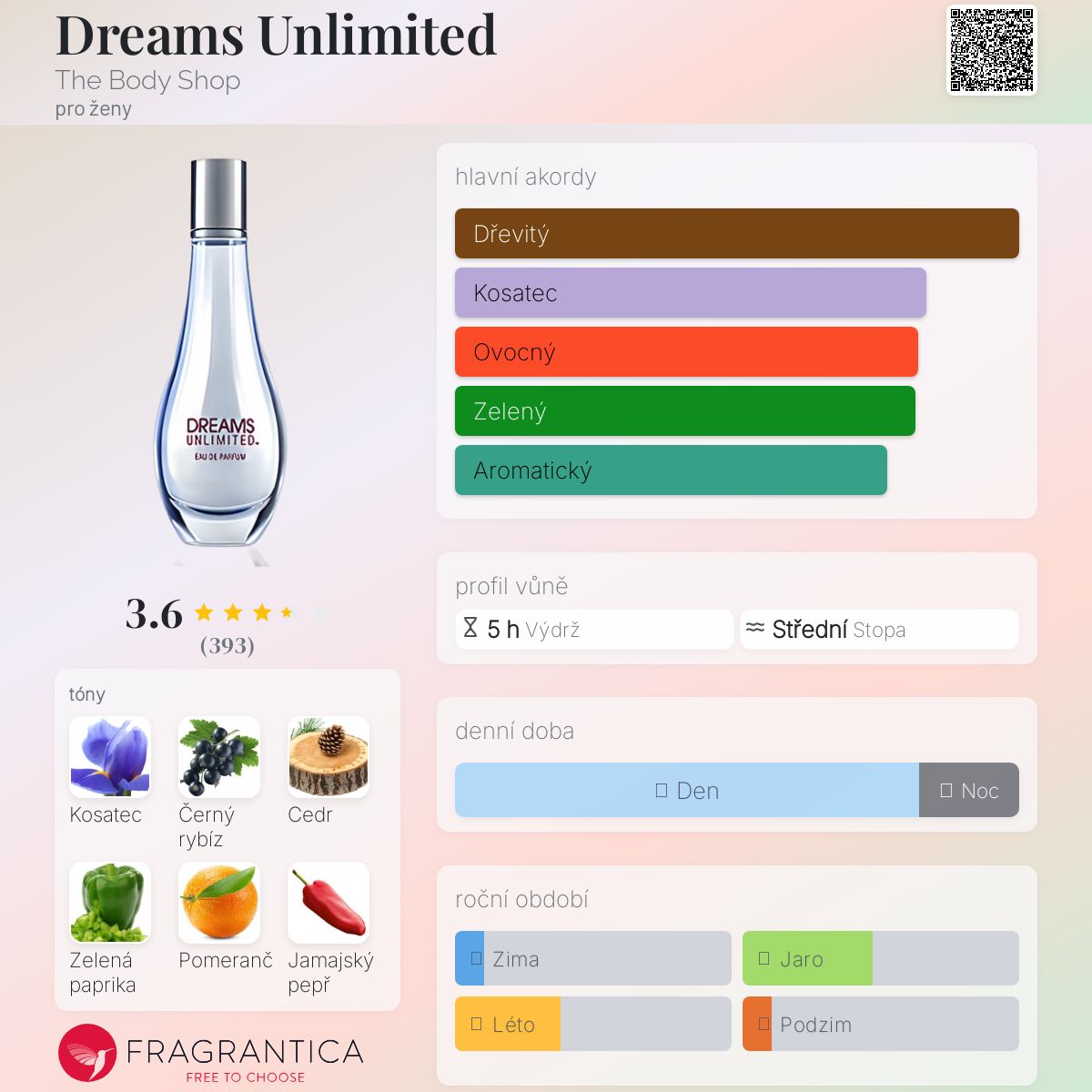 Dreams Unlimited podle The Body Shop je Floral vůně pro ženy. Dreams Unlimited byl/a uveden/a v roce 2010. Dreams Unlimited byl/a vytvořen/a Loc Dong a Anne Flipo. Vrchní tóny jsou Černý rybíz a Pomeranč; střední tóny jsouKosatec, Zelená paprika a Červená chilli paprička ; základní tón je Virginský cedr.