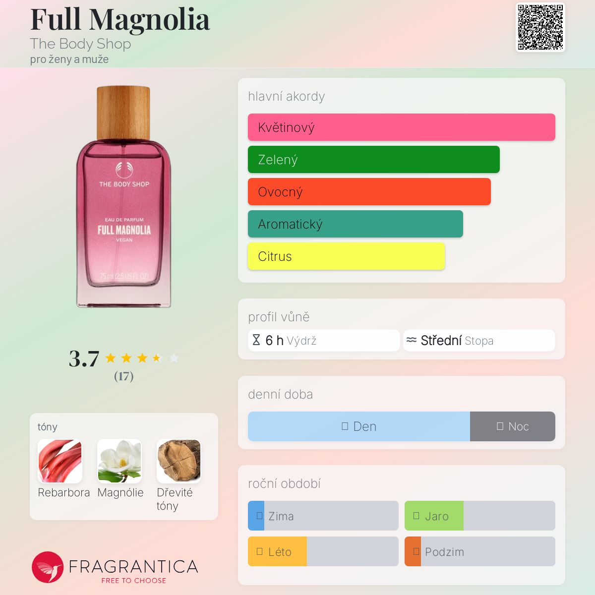 Full Magnolia podle The Body Shop je Floral Woody Musk vůně pro ženy a muže. Toto je nová vůně. Full Magnolia byl/a uveden/a v roce 2024. Vrchní tón je Rebarbora ; střední tón jeMagnólie ; základní tón je Bílé dřevo.