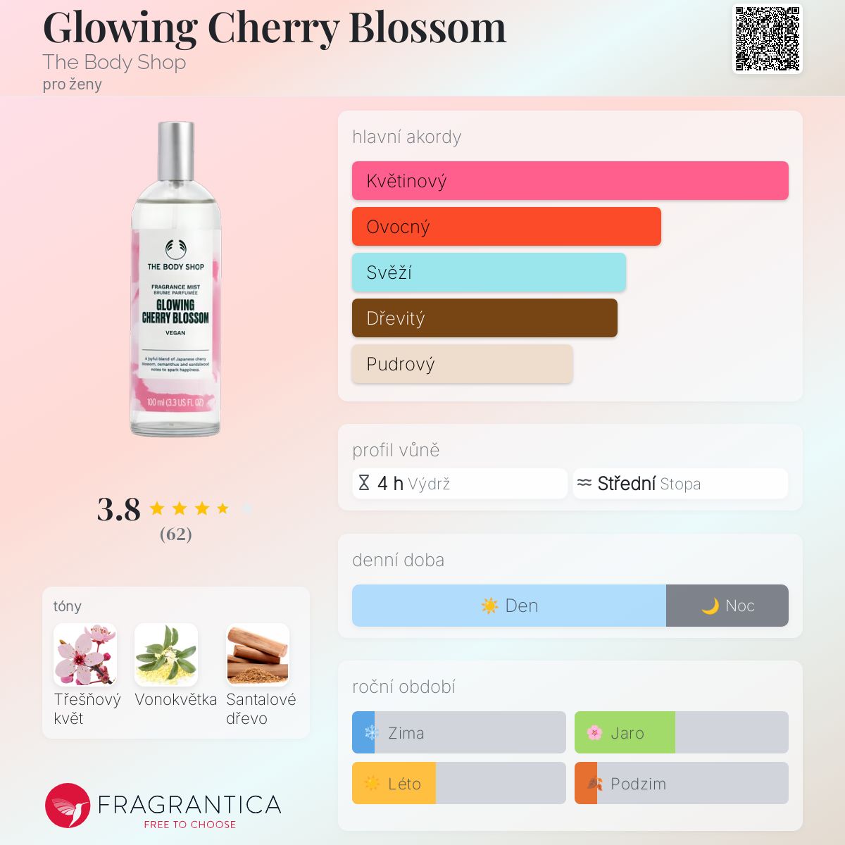 Glowing Cherry Blossom podle The Body Shop je Floral vůně pro ženy. Glowing Cherry Blossom byl/a uveden/a v roce 2022. Vrchní tón je Japonský třešňový květ ; střední tón jeVonokvětka ; základní tón je Santalové dřevo.