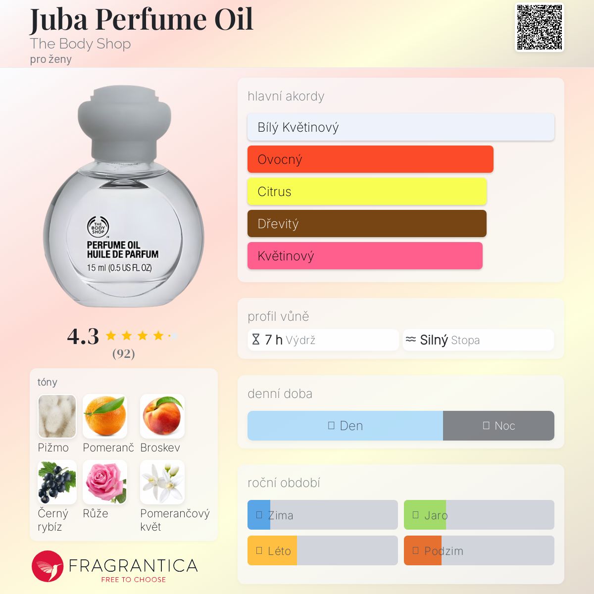 Juba Perfume Oil podle The Body Shop je Orientální vůně pro ženy. Vrchní tóny jsou Pomeranč, Broskev, Černý rybíz a Frézie; střední tóny jsouRůže, Pomerančový květ, Konvalinka a Jasmín ; základní tóny jsou Pižmo, Santalové dřevo a Vetiver.