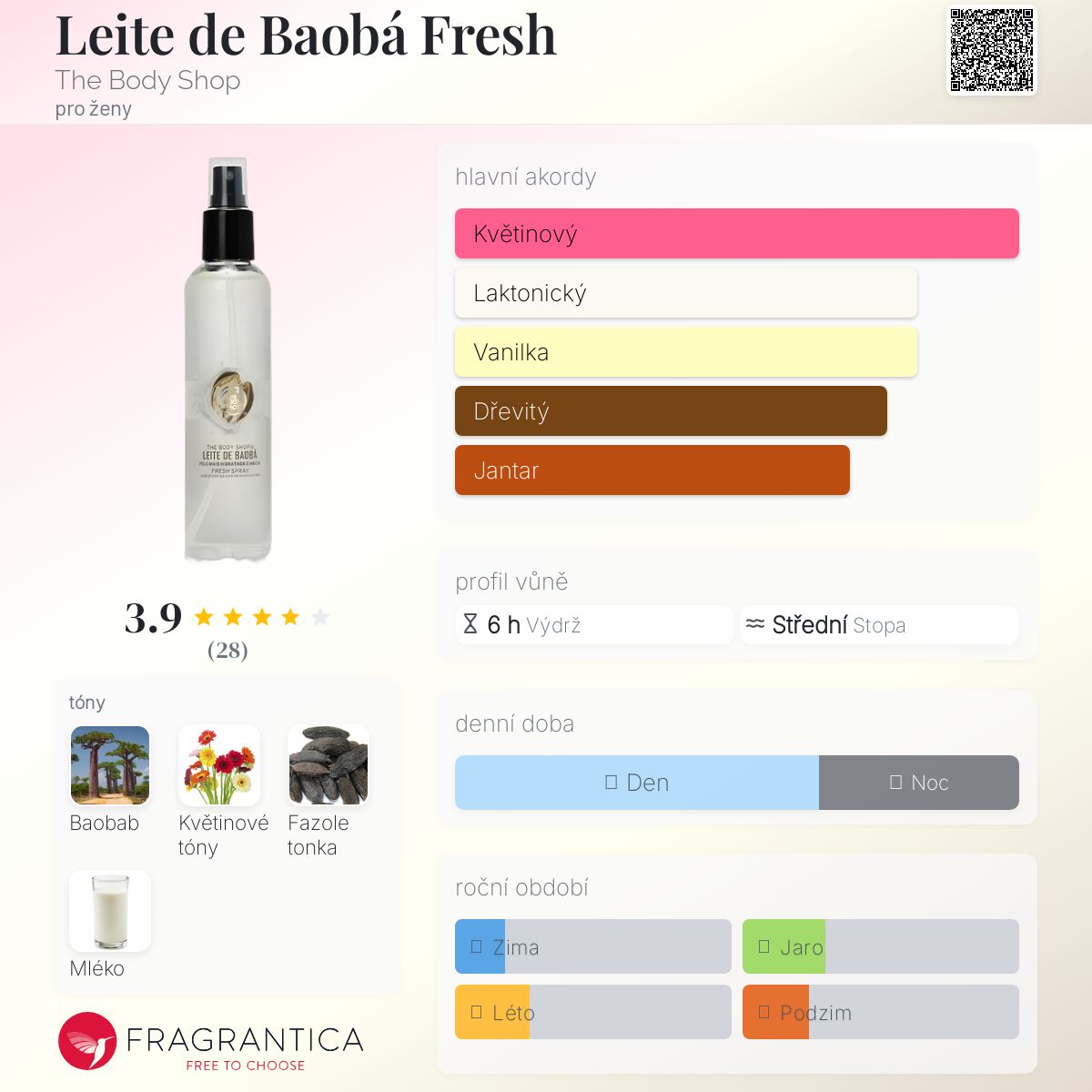 Leite de Baobá Fresh podle The Body Shop je Floral vůně pro ženy. Leite de Baobá Fresh byl/a uveden/a v roce 2017. Vrchní tón je Květinové tóny ; střední tóny jsouBaobab a Mléko ; základní tón je Fazole tonka.