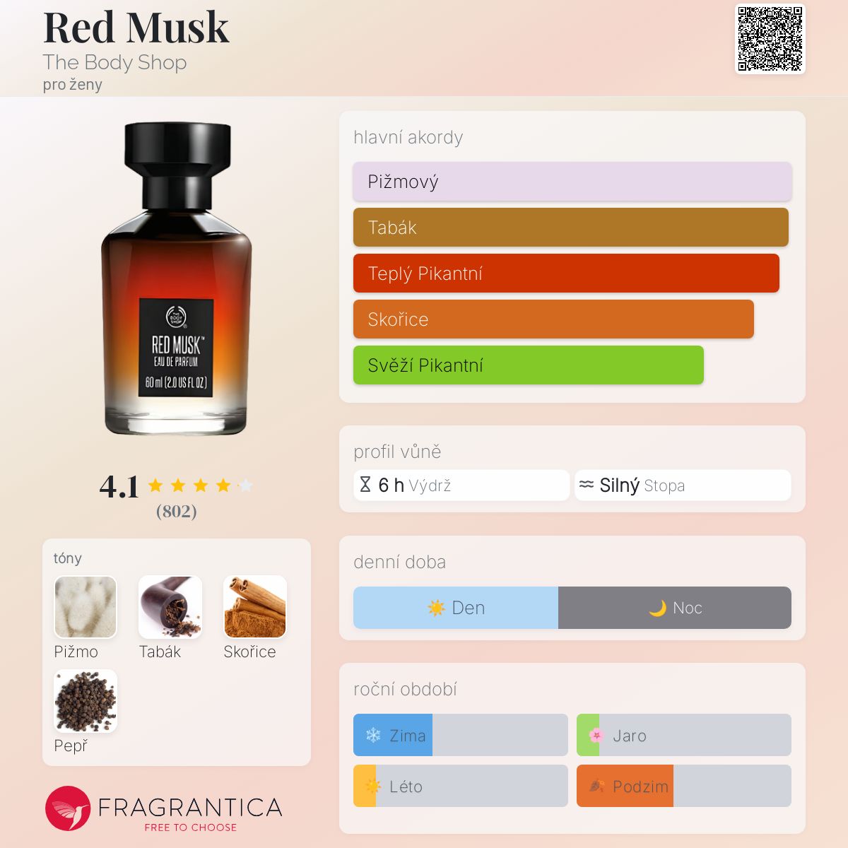 Red Musk podle The Body Shop je Aromatic Spicy vůně pro ženy. Red Musk byl/a uveden/a v roce 2014. "Nosem" za touto vůní je Corinne Cachen. Vrchní tón je Pepř ; střední tón jeSkořice ; základní tóny jsou Pižmo a Tabák.