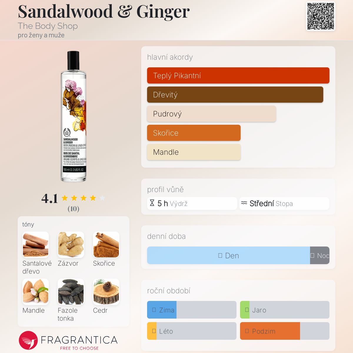 Sandalwood & Ginger podle The Body Shop je Woody Aromatic vůně pro ženy a muže. Sandalwood & Ginger byl/a uveden/a v roce 2017. Vrchní tóny jsou Skořice a Mandle; střední tóny jsouSantalové dřevo a Zázvor ; základní tóny jsou Zázvor, Fazole tonka, Cedr a Pižmo.