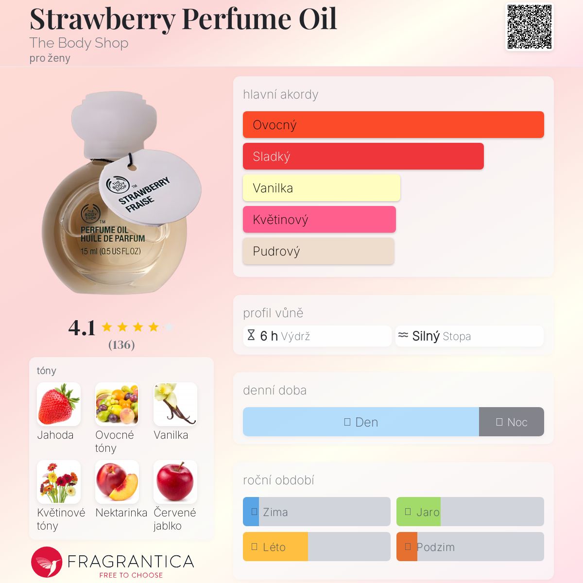 Strawberry Perfume Oil podle The Body Shop je Floral Fruity vůně pro ženy. Vrchní tóny jsou Jahoda, Červené jablko a Červený rybíz; střední tóny jsouJahoda, Ovocné tóny a Květiny ; základní tóny jsou Jahoda, Vanilka, Nektarinka a Pižmo.