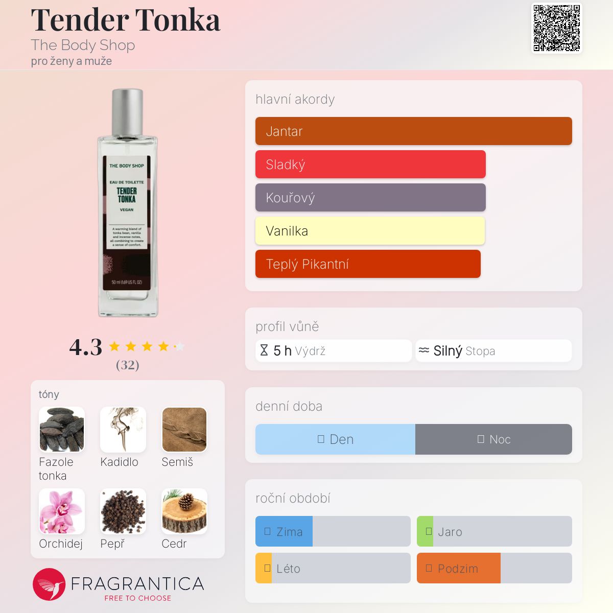 Tender Tonka podle The Body Shop je Orientální Woody vůně pro ženy a muže. Toto je nová vůně. Tender Tonka byl/a uveden/a v roce 2025. Vrchní tóny jsou Kadidlo, Pepř a Hloh; střední tóny jsouVanilková orchidej a Skalní růže ; základní tóny jsou Fazole tonka, Semiš a Cedr.