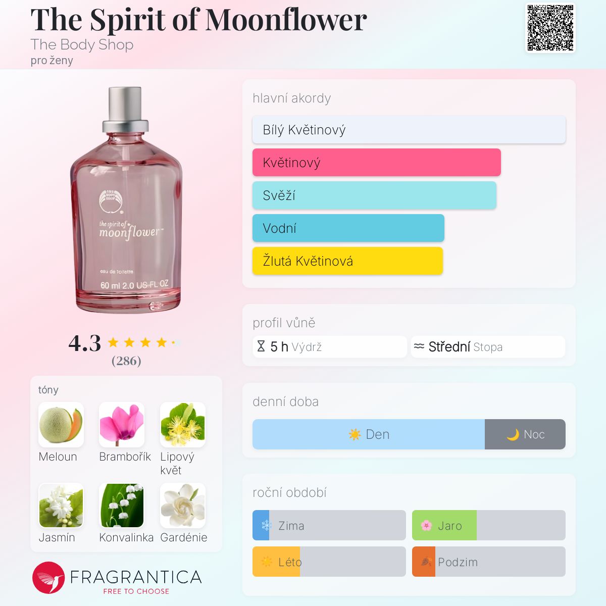 The Spirit of Moonflower podle The Body Shop je Floral vůně pro ženy. The Spirit of Moonflower byl/a uveden/a v roce 2000. Vrchní tóny jsou Meloun, Gardénie a Koriandr; střední tóny jsouBrambořík, Lipový květ a Konvalinka ; základní tóny jsou Jasmín a Růže.