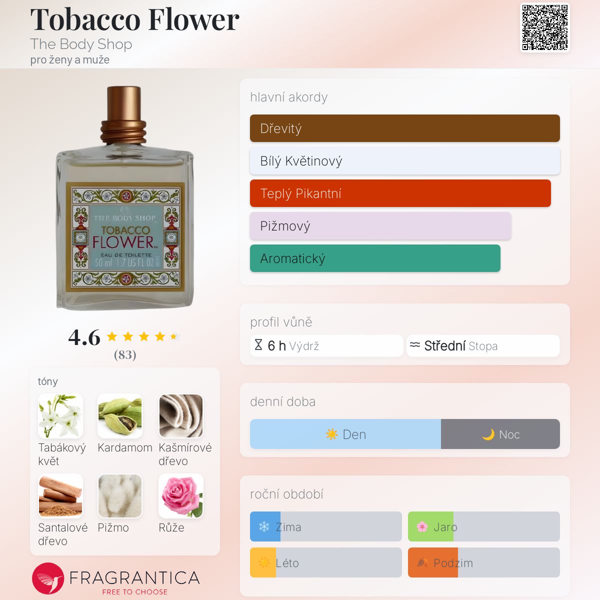 Tobacco Flower podle The Body Shop je Aromatic vůně pro ženy a muže. Tobacco Flower byl/a uveden/a v roce 2000. Vrchní tóny jsou Kardamom, Koriandr, Mandarinka, Krvavý pomeranč a Fialkový list; střední tóny jsouRůže, Jasmín a Kosatec ; základní tóny jsou Tabákový květ, Kašmírové dřevo, Santalové dřevo, Pižmo, Fazole tonka, Jantar (ambra) a Pralinka.