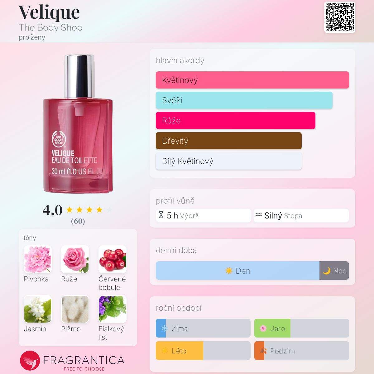 Velique podle The Body Shop je Floral vůně pro ženy. Velique byl/a uveden/a v roce 2004. Vrchní tóny jsou Červené bobule, Fialkový list a Bergamot; střední tóny jsouPivoňka, Růže, Jasmín, Brambořík a Konvalinka ; základní tóny jsou Bílé pižmo, Santalové dřevo a Sekvoje.