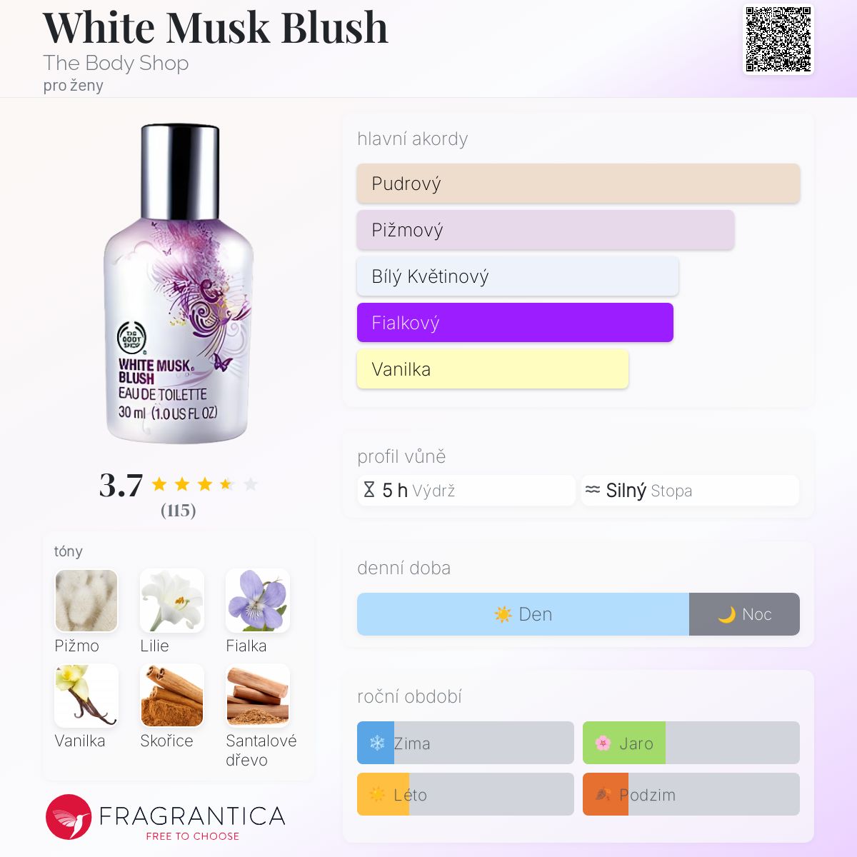White Musk Blush podle The Body Shop je Floral Fruity vůně pro ženy. White Musk Blush byl/a uveden/a v roce 2007. Vrchní tóny jsou Skořice, Jablko, Bergamot a Mandarinka; střední tóny jsouLilie, Bílá fialka, Broskev, Frézie a Šípek ; základní tóny jsou Pižmo, Vanilka, Santalové dřevo a Jantar (ambra).