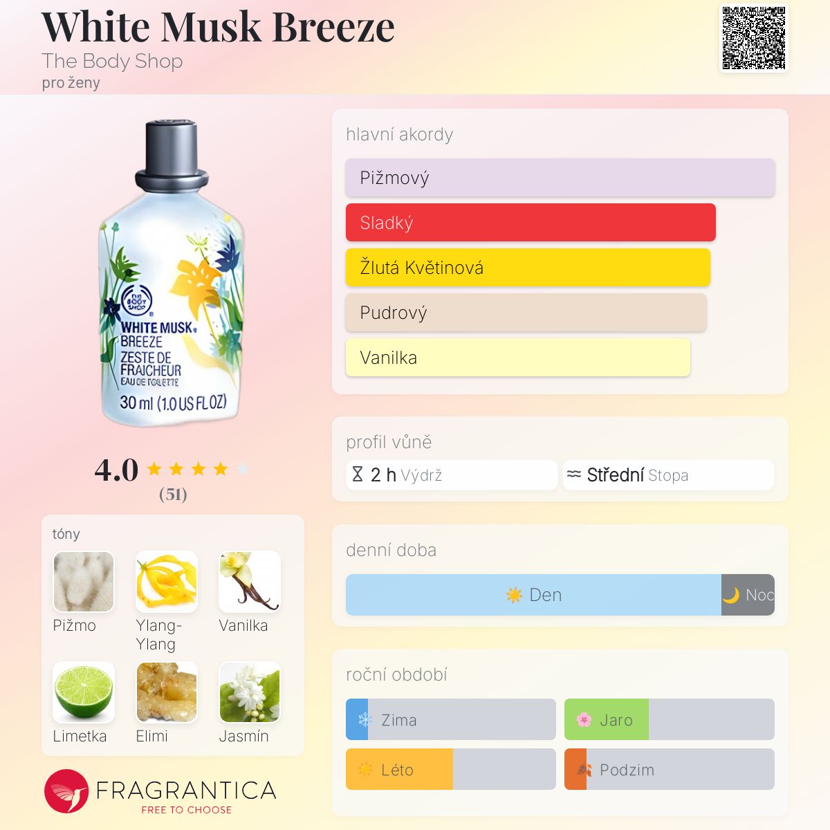 White Musk Breeze podle The Body Shop je Floral vůně pro ženy. White Musk Breeze byl/a uveden/a v roce 2010. Vrchní tóny jsou Limetka, Pryskyřice elimi, Pomeranč, Broskev, Švestka, Grapefruit, Citron amalfi a Zelené tóny; střední tóny jsouYlang-Ylang, Jasmín, Konvalinka, Tinktura z růže, Aksamitník, Vodní tóny a Karafiát ; základní tóny jsou Pižmo, Vanilka, Virginský cedr a Pačuli.