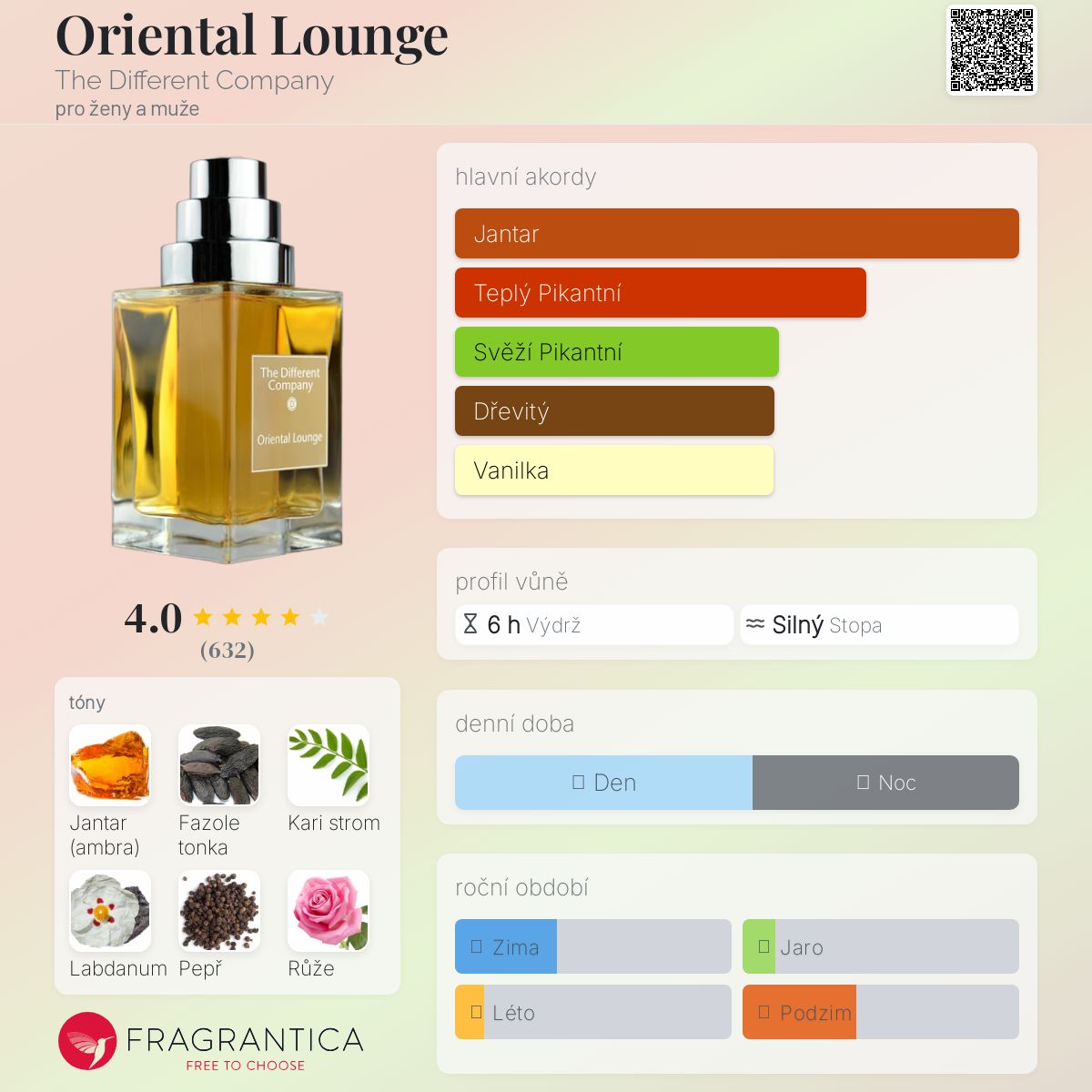 Oriental Lounge podle The Different Company je Orientální vůně pro ženy a muže. Oriental Lounge byl/a uveden/a v roce 2009. "Nosem" za touto vůní je Céline Ellena. Vrchní tóny jsou Kari strom, Pepř a Bergamot; střední tóny jsouRůže a Saténové dřevo ; základní tóny jsou Jantar (ambra), Fazole tonka a Francouzské labdanum.