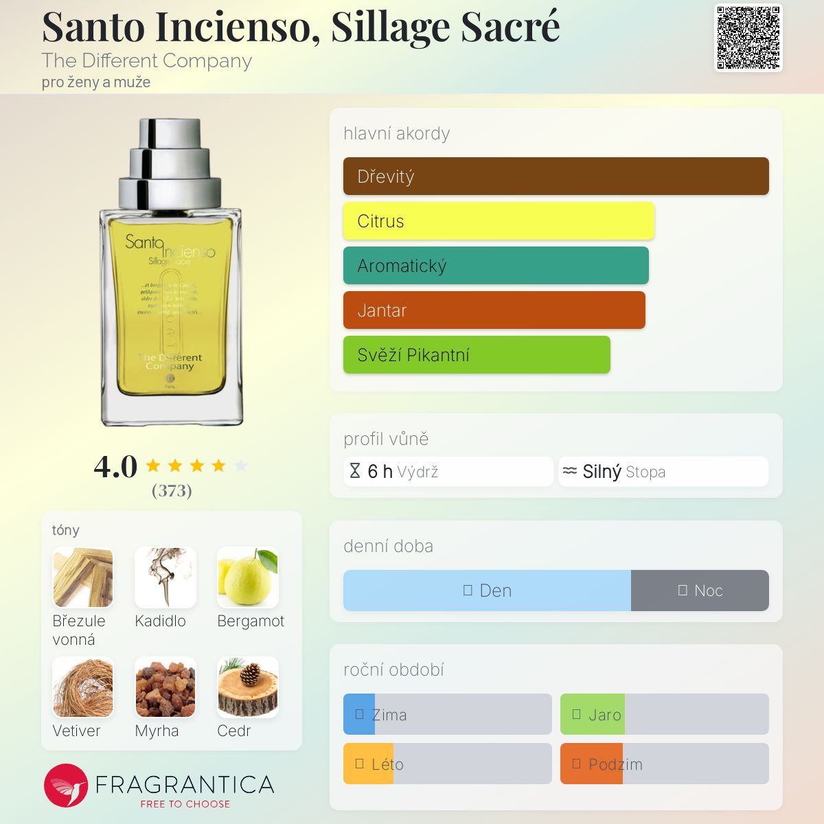 Santo Incienso, Sillage Sacré podle The Different Company je Woody vůně pro ženy a muže. Santo Incienso, Sillage Sacré byl/a uveden/a v roce 2017. "Nosem" za touto vůní je Alexandra Monet. Vrchní tóny jsou Kalábrijský bergamot, Muškátový oříšek a Petitgrain; střední tóny jsouBřezule vonná, Atlasový cedr a Hedione ; základní tóny jsou Kadidlo, Vetiver, Myrha, Guajakové dřevo a Pižmo.