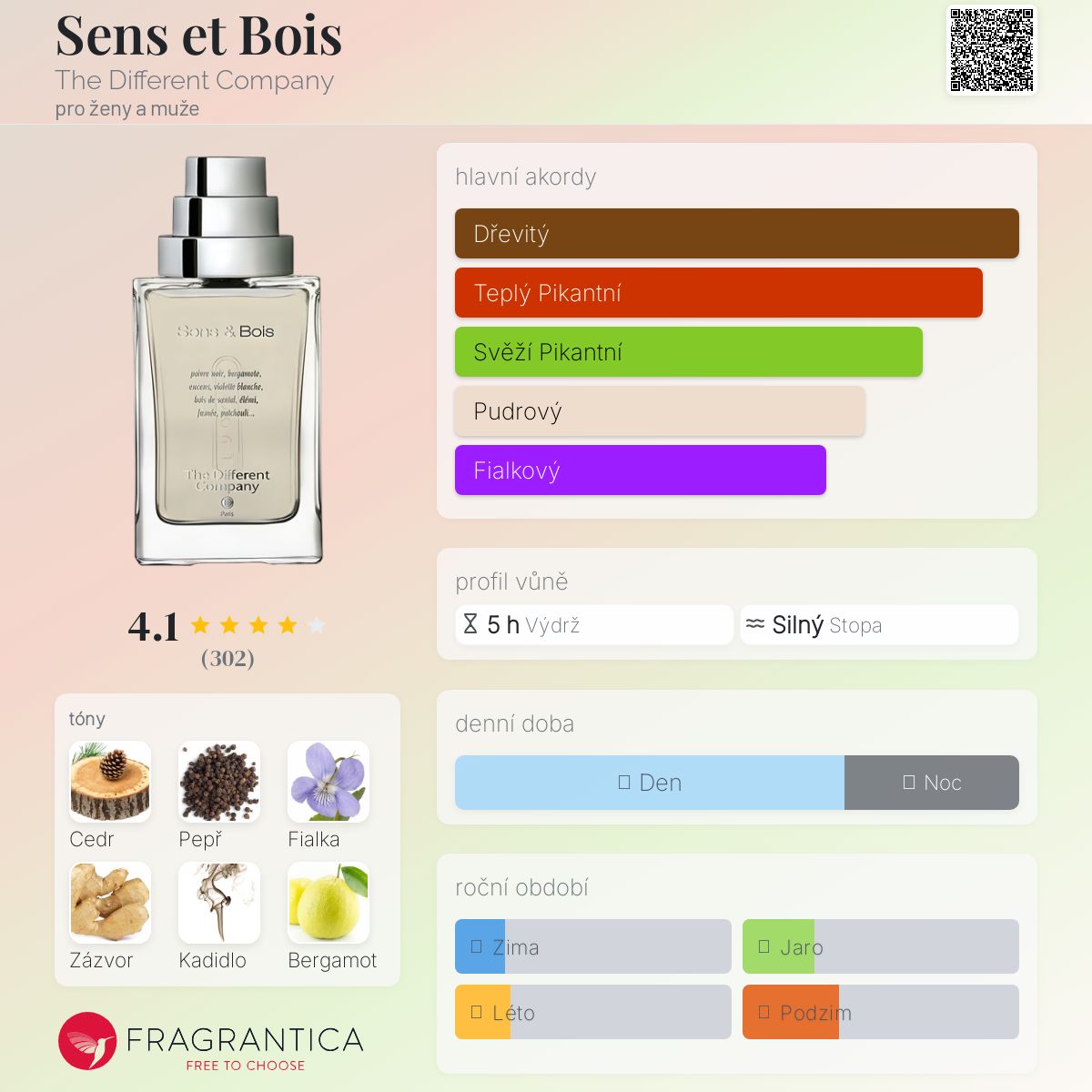 Sens et Bois podle The Different Company je Woody Spicy vůně pro ženy a muže. Sens et Bois byl/a uveden/a v roce 2006. "Nosem" za touto vůní je Céline Ellena. Vrchní tóny jsou Pepř, Zázvor a Bergamot; střední tóny jsouFialka, Kadidlo a Neroli ; základní tóny jsou Cedr, Santalové dřevo a Pačuli.