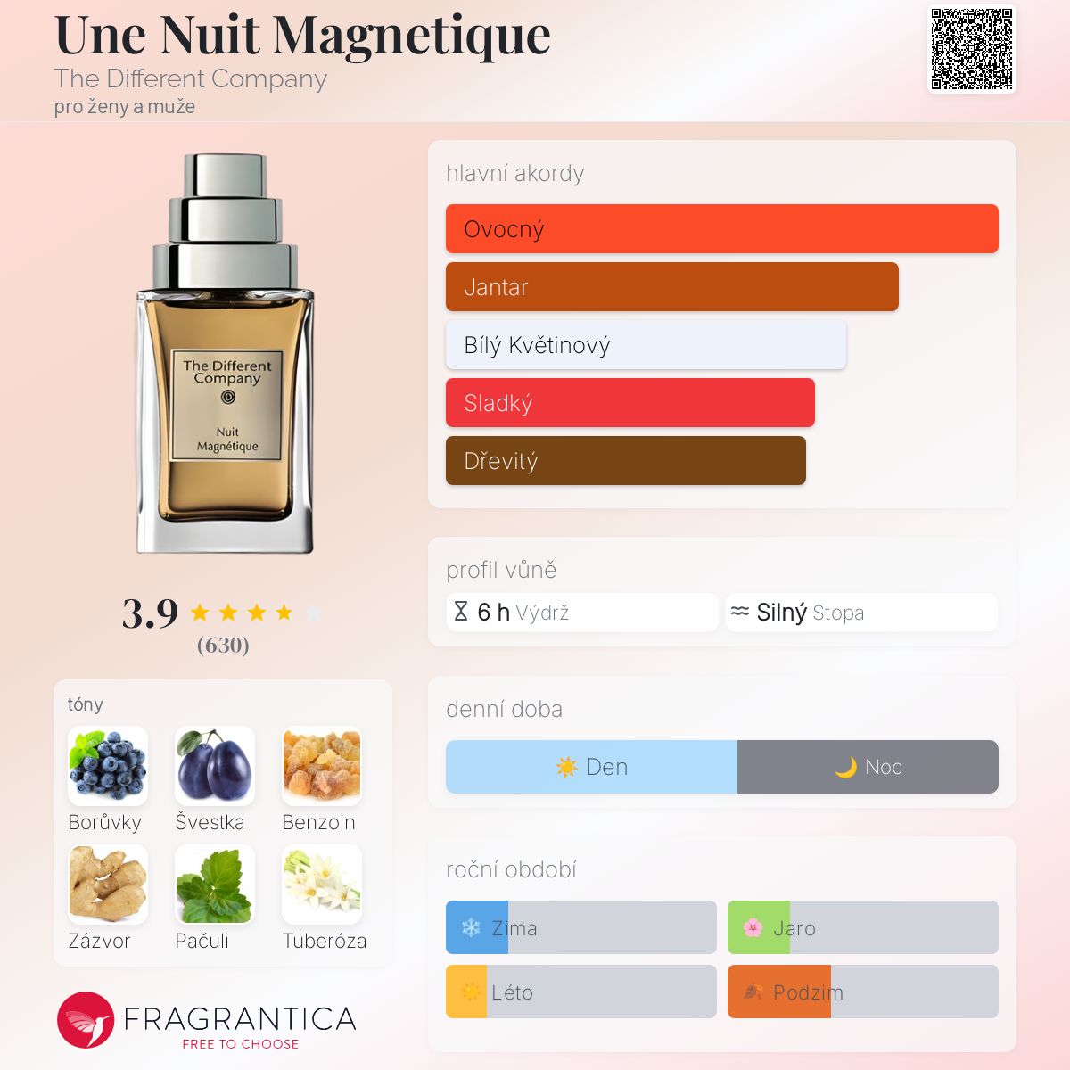 Une Nuit Magnetique podle The Different Company je Floral Woody Musk vůně pro ženy a muže. Une Nuit Magnetique byl/a uveden/a v roce 2014. "Nosem" za touto vůní je Christine Nagel. Vrchní tóny jsou Borůvky, Zázvor a Bergamot; střední tóny jsouŠvestka, Tuberóza, Egyptský jasmín a Turecká růže ; základní tóny jsou Benzoin, Pačuli, Jantar (ambra), Dřevité tóny a Pižmo.