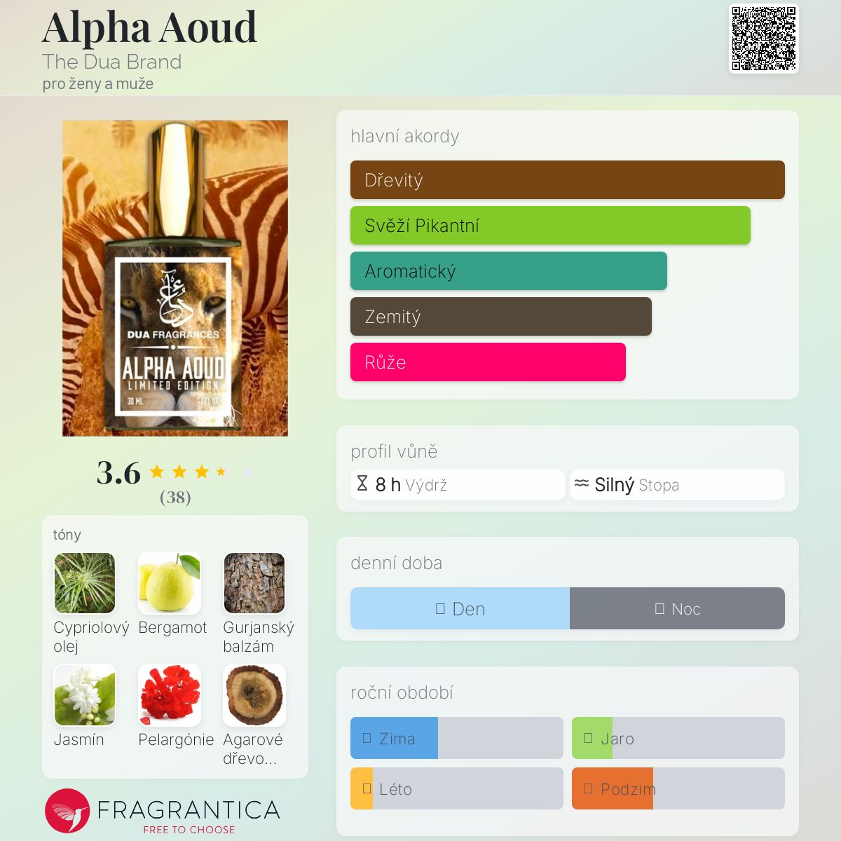 Alpha Aoud podle The Dua Brand je Orientální Woody vůně pro ženy a muže. Alpha Aoud byl/a uveden/a v roce 2016. "Nosem" za touto vůní je Mahsam Raza. Vrchní tóny jsou Cypriolový olej, Sicilský bergamot, Gurjanský balzám a Kozlík lékařský; střední tóny jsouEgyptský jasmín, Pelargónie, Bulharská růže, Muškátový oříšek a Oregano ; základní tóny jsou Agarové dřevo (oud), Pačuli, Haitský vetiver, Bříza a Labdanum.