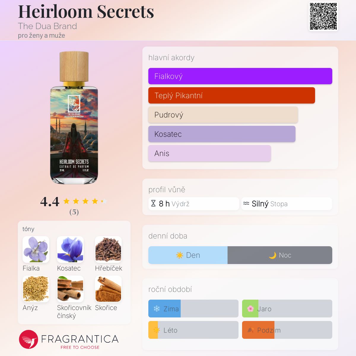 Heirloom Secrets podle The Dua Brand je vůně pro ženy a muže. Toto je nová vůně. Heirloom Secrets byl/a uveden/a v roce 2024.