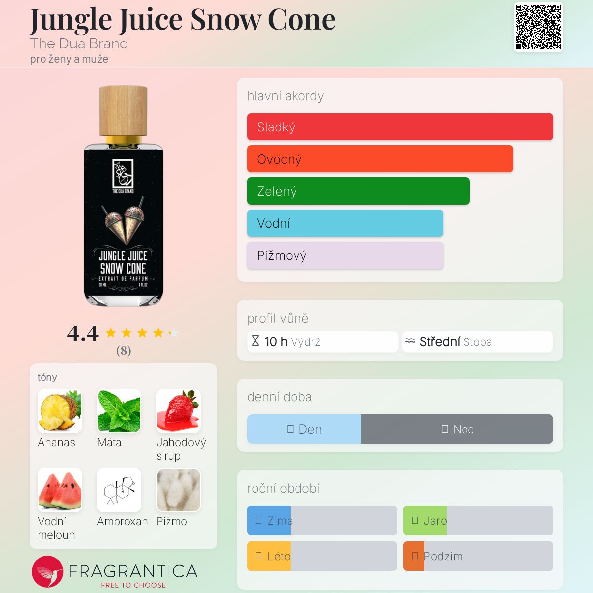 Jungle Juice Snow Cone podle The Dua Brand je Floral Fruity Gourmand vůně pro ženy a muže. Jungle Juice Snow Cone byl/a uveden/a v roce 2022.