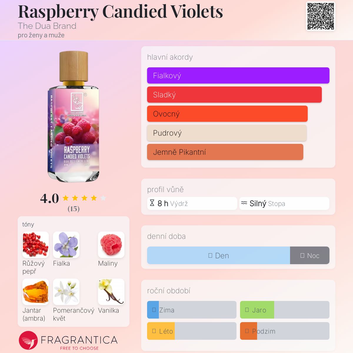 Raspberry Candied Violets podle The Dua Brand je vůně pro ženy a muže. Toto je nová vůně. Raspberry Candied Violets byl/a uveden/a v roce 2024. Vrchní tóny jsou Růžový pepř, Maliny a Vanilkový cukr; střední tóny jsouPomerančový květ, Otočník a Mandle ; základní tóny jsou Fialka, Jantar (ambra), Černé pižmo a Pižmo.