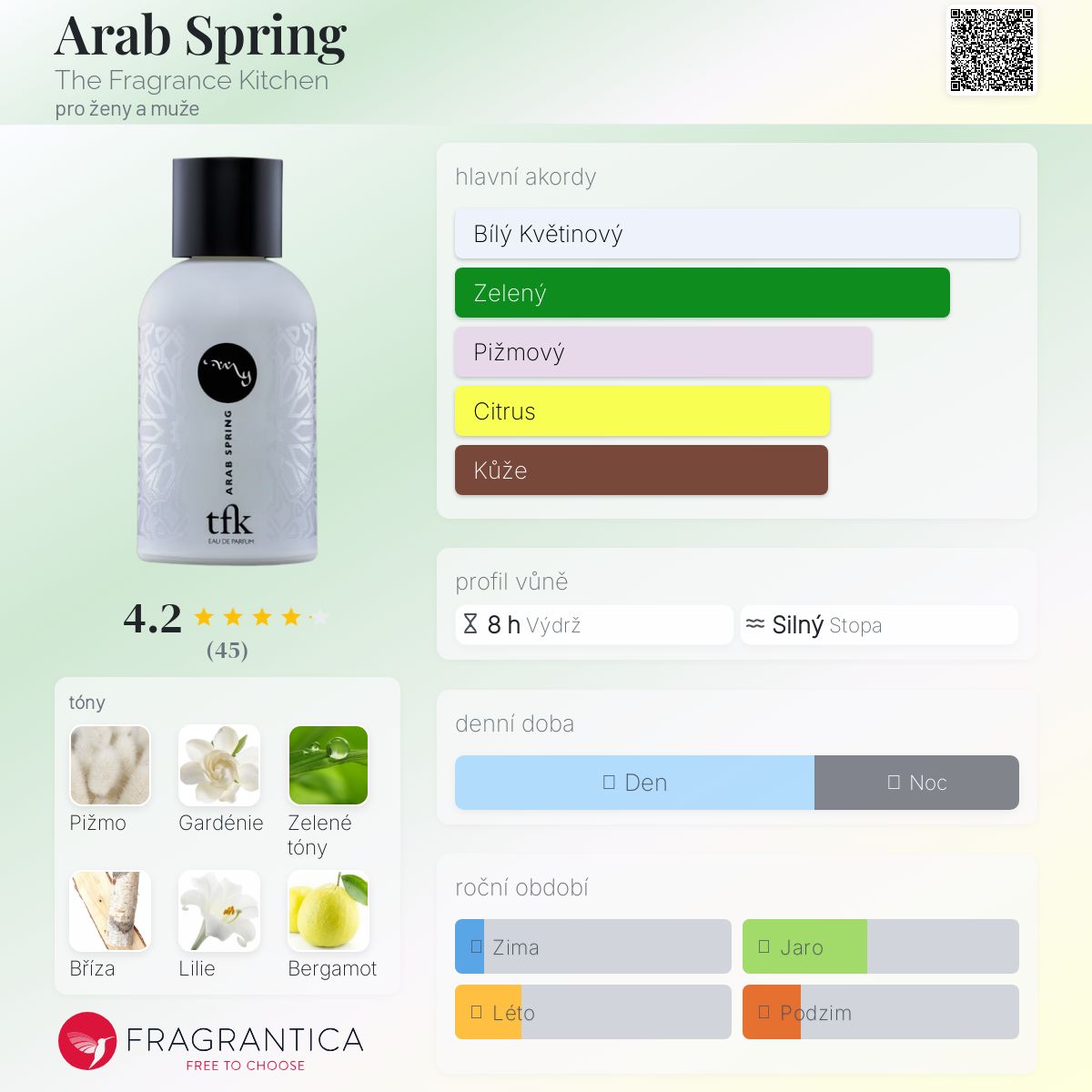 Arab Spring podle The Fragrance Kitchen je Floral Green vůně pro ženy a muže. Arab Spring byl/a uveden/a v roce 2013. Vrchní tóny jsou Zelené tóny, Kalábrijský bergamot a Limetka; střední tóny jsouBílá lilie, Konvalinka a Zelený čaj ; základní tóny jsou Bílé pižmo, Gardénie a Bříza.