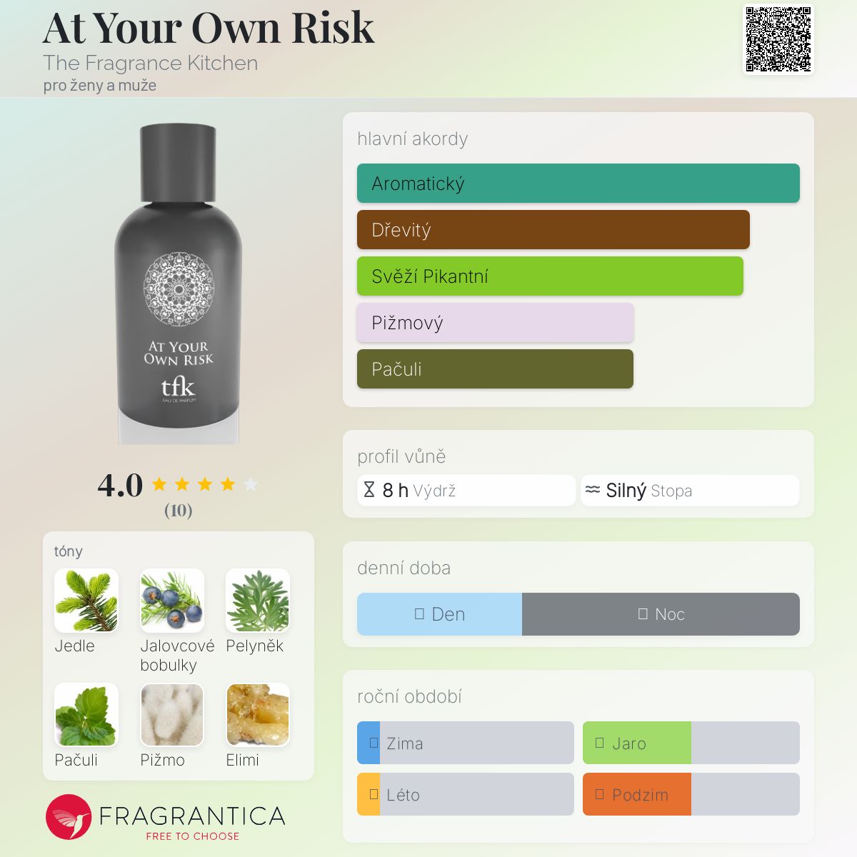 At Your Own Risk podle The Fragrance Kitchen je Chypre Fruity vůně pro ženy a muže. Vrchní tóny jsou Jalovcové bobulky, Citrón a Pomeranč; střední tóny jsouJedle balzámová, Pelyněk a Elimi ; základní tóny jsou Pačuli, Pižmo a Jantar (ambra).
