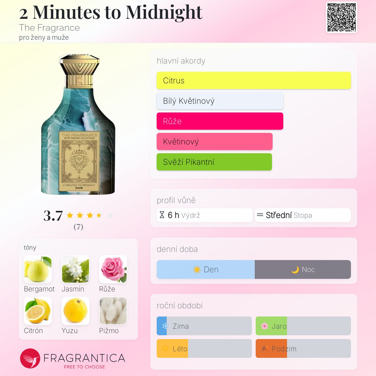 2 Minutes to Midnight podle The Fragrance je Orientální Floral vůně pro ženy a muže. Toto je nová vůně. 2 Minutes to Midnight byl/a uveden/a v roce 2025. Vrchní tóny jsou Bergamot, Citrón a Yuzu; střední tóny jsouJasmín a Růže ; základní tóny jsou Pižmo, Jantar (ambra), Agarové dřevo (oud) a Vanilka.