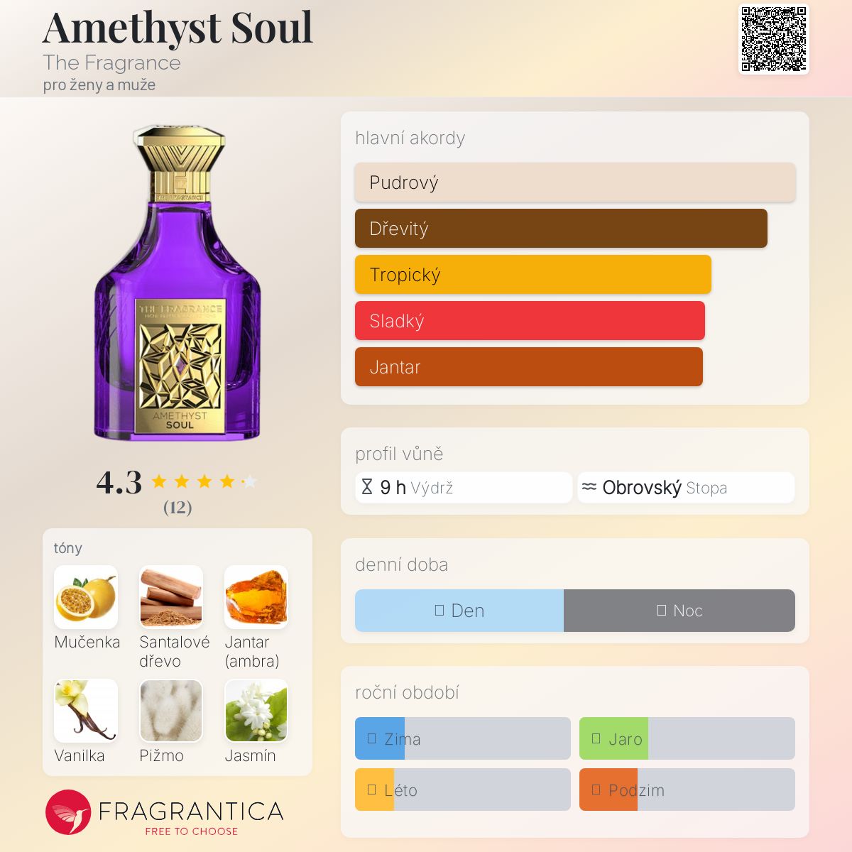 Amethyst Soul podle The Fragrance je Floral Fruity vůně pro ženy a muže. Vrchní tóny jsou Mučenka a Broskev; střední tóny jsouSantalové dřevo, Jasmín, Tuberóza a Růže ; základní tóny jsou Jantar (ambra), Vanilka a Pižmo.