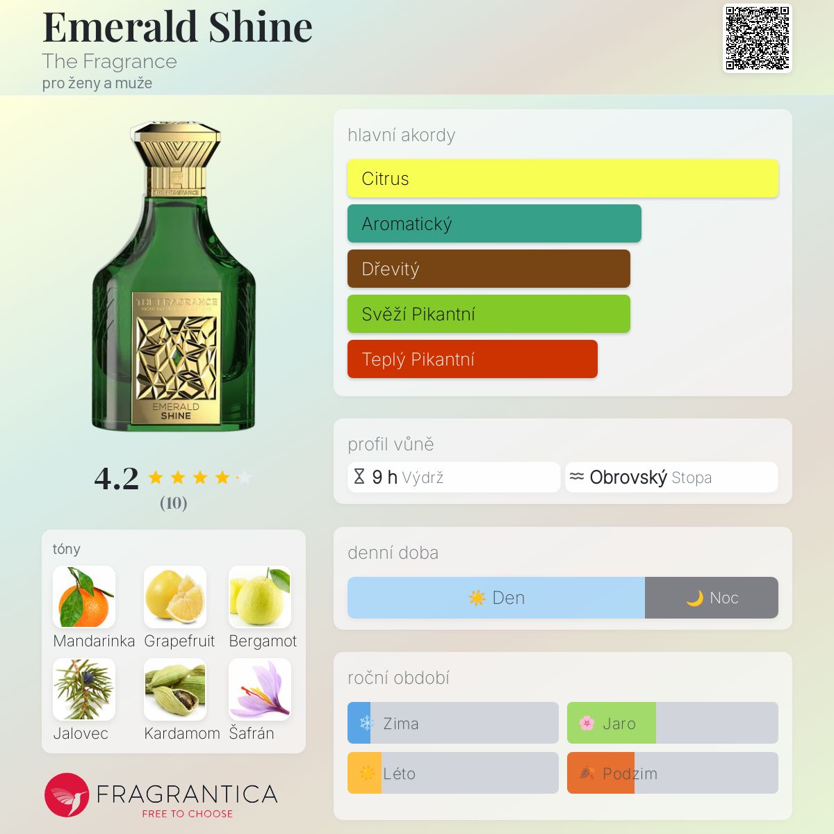 Emerald Shine podle The Fragrance je Orientální vůně pro ženy a muže. Vrchní tóny jsou Mandarinka, Grapefruit a Bergamot; střední tóny jsouJalovec, Kardamom, Šafrán a Kadidlo ; základní tóny jsou Cypriolový olej, Pačuli, Vetiver, Cedr, Guajakové dřevo, Agarové dřevo (oud), Kůže, Jantar (ambra) a Pižmo.