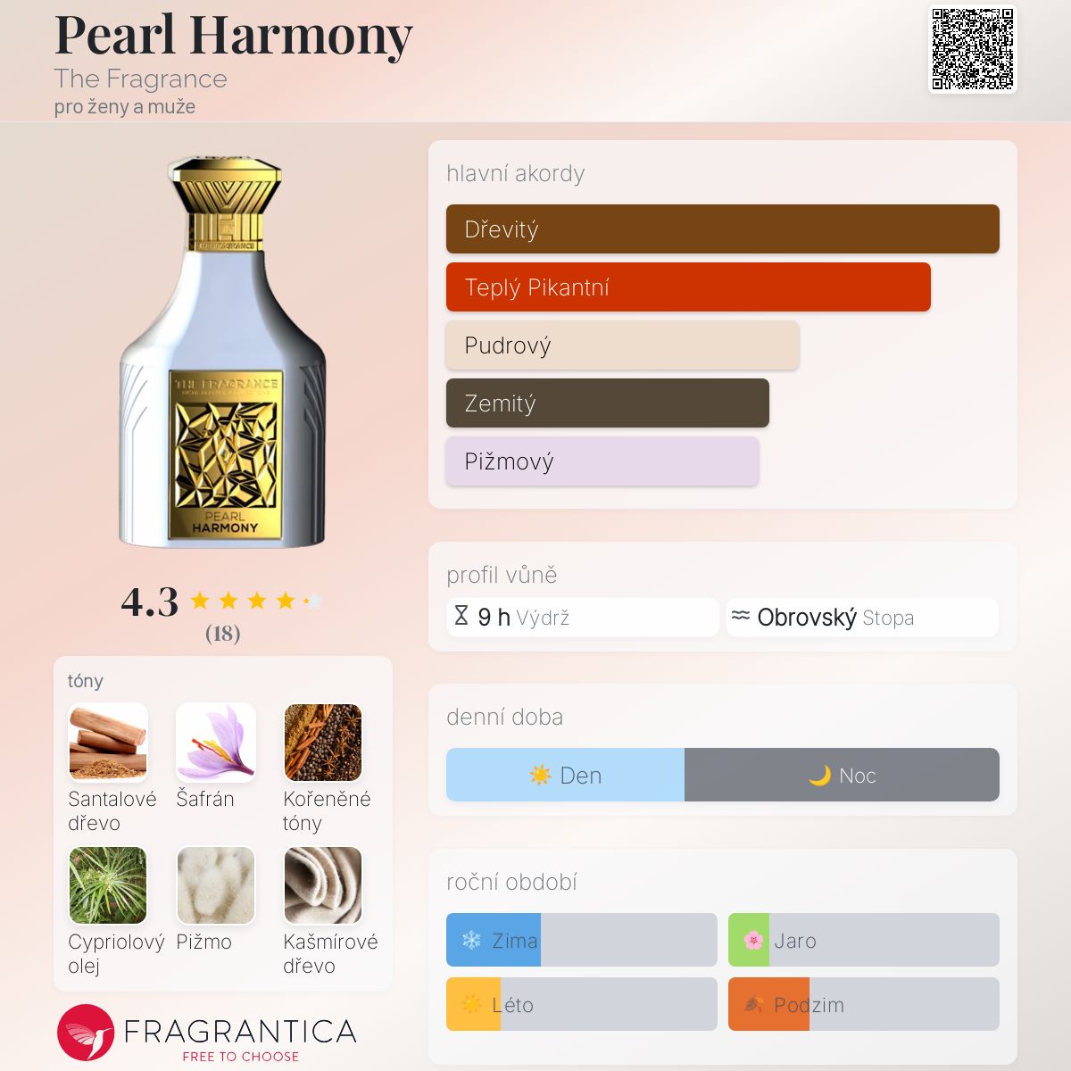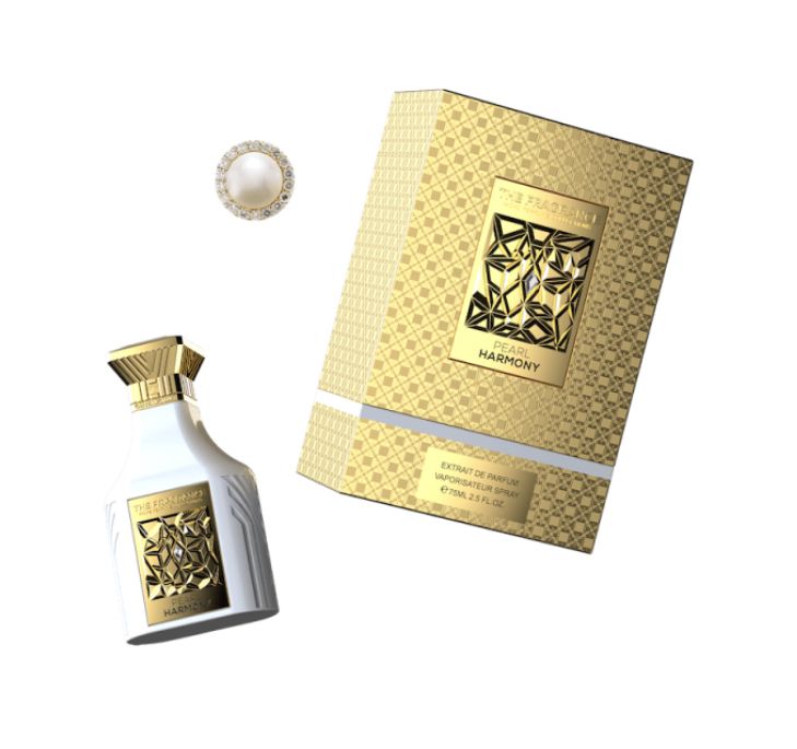 Pearl Harmony podle The Fragrance je Woody vůně pro ženy a muže. Vrchní tóny jsou Šafrán, Kořeněné tóny a Růže; střední tóny jsouSantalové dřevo a Cypriolový olej ; základní tóny jsou Pižmo, Kašmírové dřevo, Cedr a Jantar (ambra).