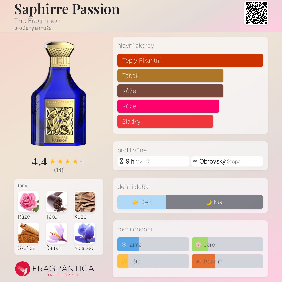 Saphirre Passion podle The Fragrance je vůně pro ženy a muže. Vrchní tóny jsou Skořice, Šafrán, Kardamom, Růžový pepř, Bergamot a Ovocné tóny; střední tóny jsouRůže, Tabák, Kůže, Kosatec, Labdanum a Frézie ; základní tóny jsou Fazole tonka, Santalové dřevo, Jantar (ambra), Vanilka, Pižmo a Cedr.