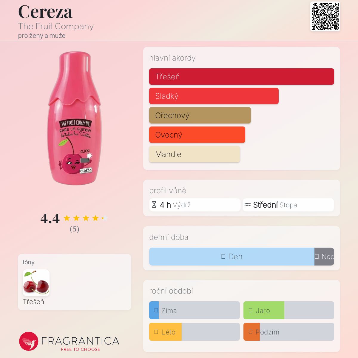 Cereza podle The Fruit Company je Aromatic Fruity vůně pro ženy a muže. Toto je nová vůně. Cereza byl/a uveden/a v roce 2024.